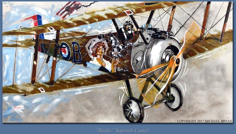 Michael Bryan "Birdie" is a 48x96" original mixed-media painting on aluminum Featuring a WWI Sopwith Camel in action