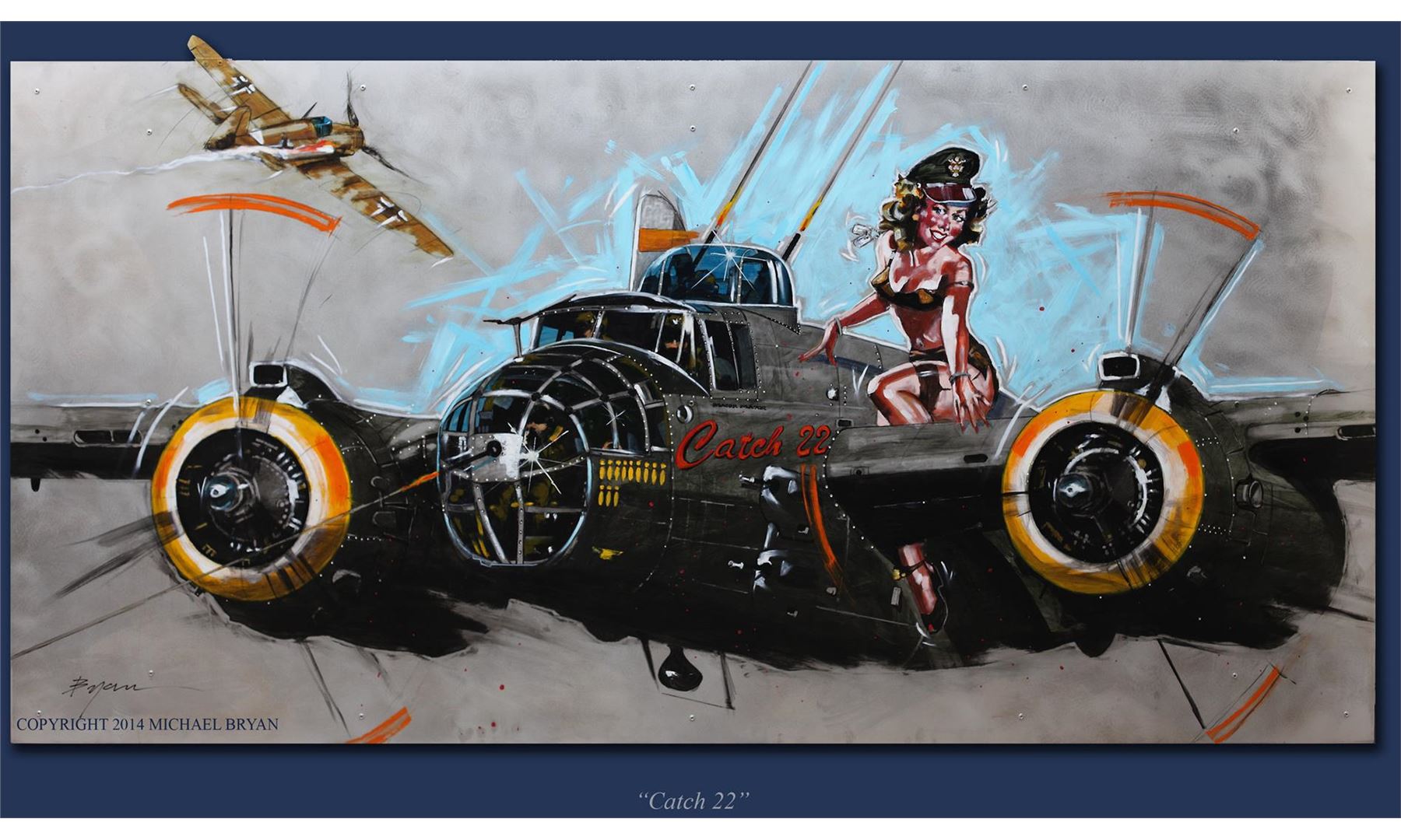 Michael Bryan "Catch 22" is a 20x40" Unique handworked giclee on canvas 1/1 Features the famous WWII twin-engine B-24 fighter .