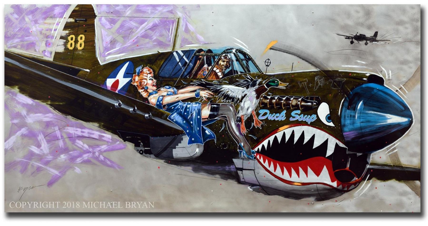 Michael Bryan's "Duck Soup" is a 20x40" Ltd.Edition handworked giclee on canvas featuring the legendary WWII fighter P40. Unique 1/1