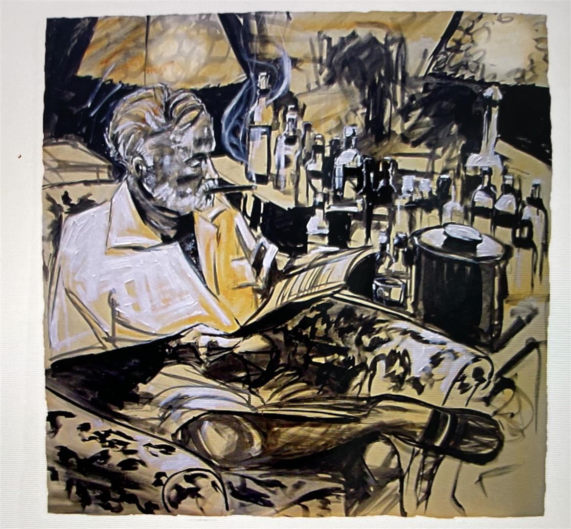 Michael Bryan "Hemingway in Cuba" is a Ltd Edition 40x40" giclee on canvas. The great man sits at home reading and (guess what?) drinking .