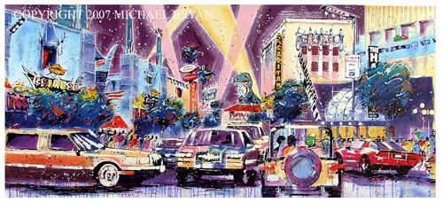 Michael Bryan "Hollywood Boulevard" is a Ltd Edition serigraph 16.5x36" on paper depicting Hollywood's famous landmark theatres and restaurants.