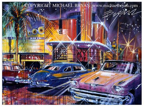 Michael Bryan "South Beach" 30x40" original mixed-media canvas reminds us of hot summer nights in south Florida & its vintage cars .