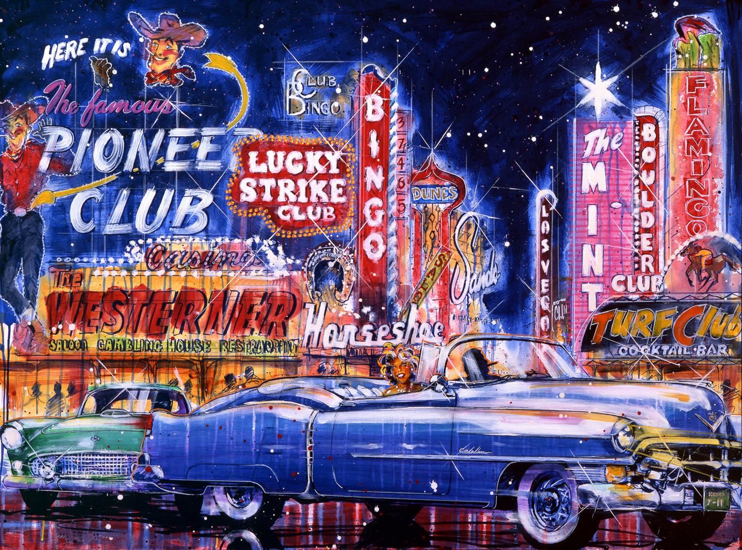 Michael Bryan's "Vintage Vegas" depicts famous Vegas Casinos from a by-gone era. It is a 30x40" hand worked giclee on canvas unique 1/1
