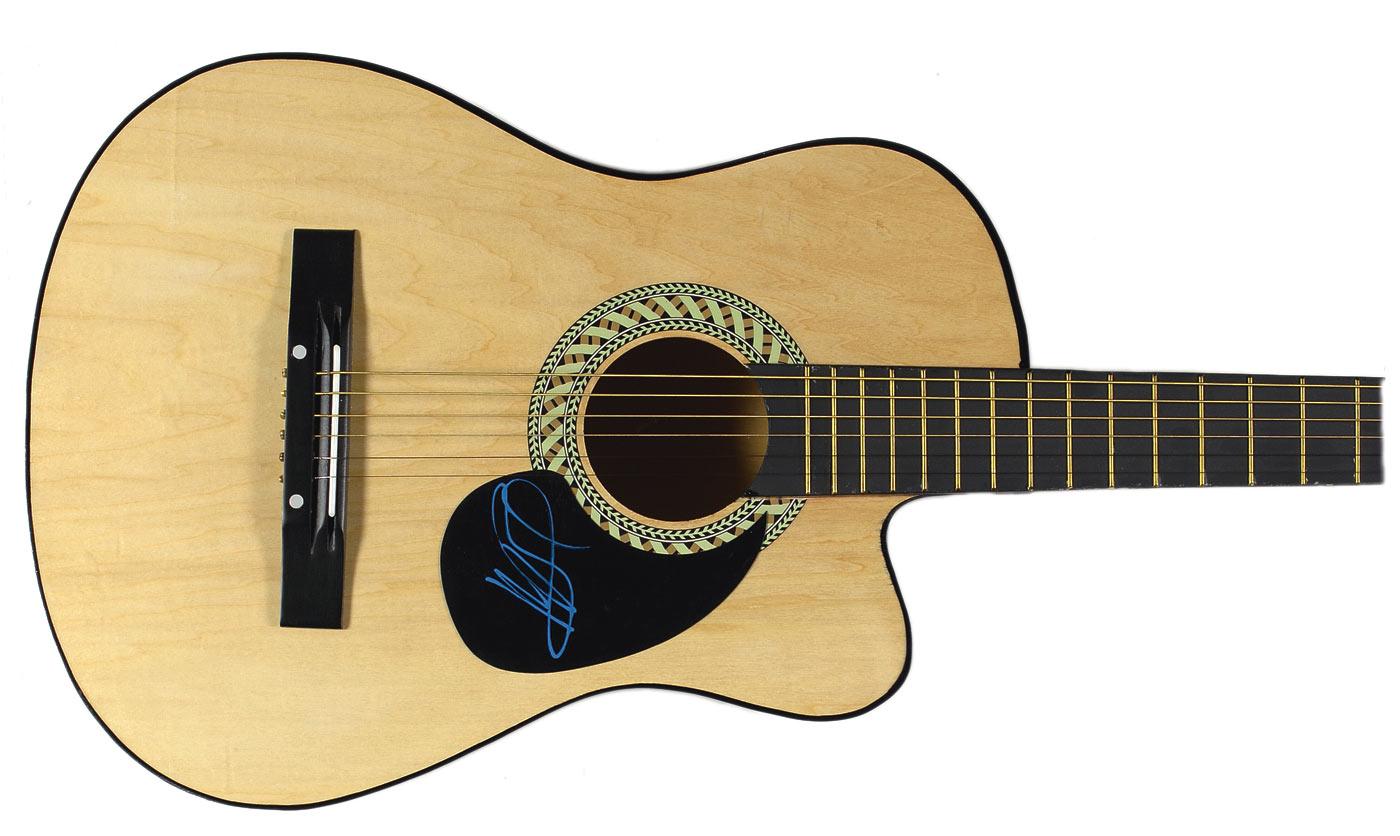 Natural wood-finish six-string acoustic guitar, signed on the black pickguard in blue ink. In fine condition. Oversized. RRAuction COA.