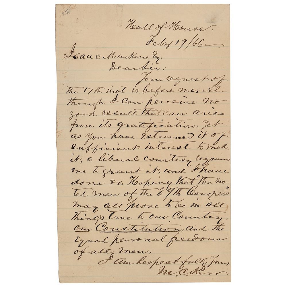 Attorney and legislator (1827-1876) who served as the first Democratic Speaker of the House after the Civil War. ALS signed "M. C. Kerr," one page, 5 x 8, February 19, 1866. Handwritten letter from "Hall of House," expressing patriotic sentiments. In full: "Your request of the 17th inst. is before me. Although I can perceive no good result that can arise from its gratification, yet as you have esteemed it of sufficient interest to make it, a liberal courtesy requires me to grant it, and I have done so. Hoping that 'the noted men of the 39th Congress' may all prove to be in all things true to our Country, our Constitution, and the equal personal freedom of all men." In fine condition, with a paperclip impression to the top edge. Accompanied by an unsigned original albumen portrait of Kerr.