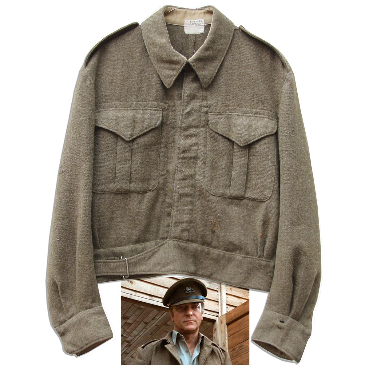 Michael Caine military jacket from the 1981 WWII film, ''Escape to Victory''. Caine played English Captain John Colby. Olive green wool jacket has original ''M. Berman Ltd.'' British costumer tag intact. Measures 20'' shoulder to shoulder x 24''. Near fine.