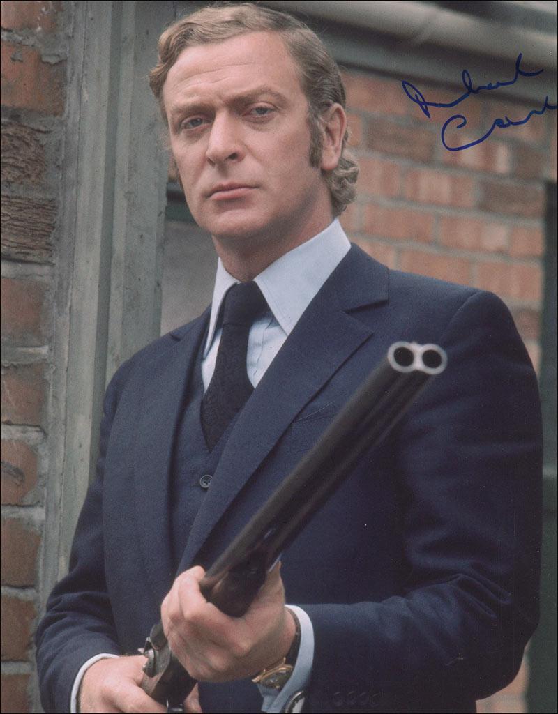 Imposing color glossy 11 x 14 photo of Caine wielding a shotgun in Get Carter, signed in blue felt tip. In fine condition.