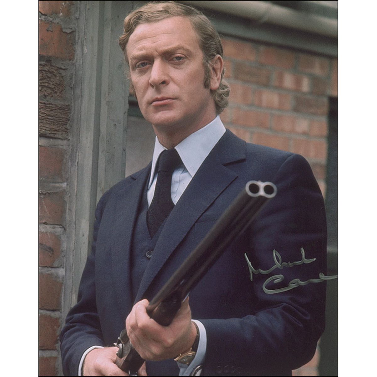 Color glossy 8 x 10 photo of Caine from Get Carter, signed in silver ink. In fine condition.