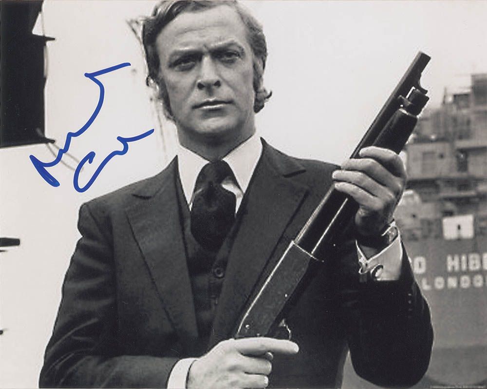 Satin-finish 10 x 8 photo of Caine in Get Carter, boldly signed in-person in blue felt tip. In very fine condition, with a slightly grainy quality to the image. Originally obtained by in-person specialist Mike Wehrmann.