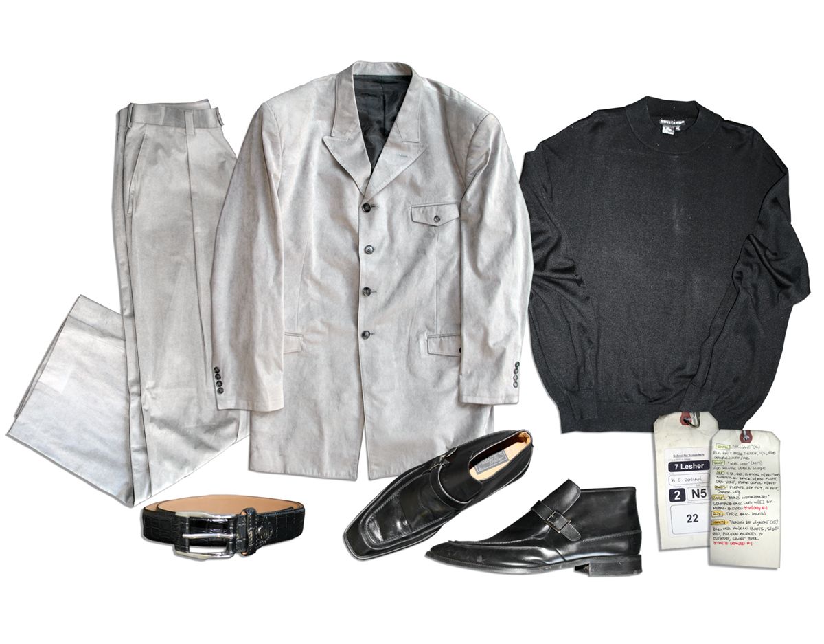 Michael Clark Duncan screen-worn, ''hero'' wardrobe from the comedy ''School for Scoundrels.'' Duncan plays Lesher, an assistant to Billy Bob Thornton who runs an unorthodox self-help class designed to build confidence. This complete ensemble includes a silver suede suit jacket (no size), matching suede slacks (no size), black XL Tulliano mock turtleneck sweater in a silk/cotton blend, size 42 Demarco Giouani black leather belt (tagged ''Lesher Hero''), and size 15M Henri DeVignon black leather ankle-high shoes. Includes a costume department wardrobe tag that lists M.C. Duncan, character name, scene number, and fuller wardrobe description. With a COA from Premiere Props. Near fine.