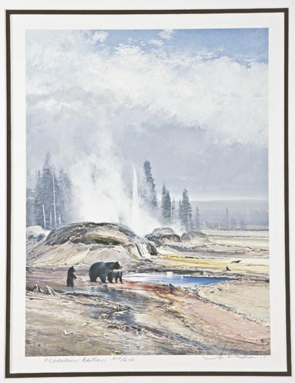 Michael Coleman hand-signed medallion edition print showing bears in Yellowstone National Park, numbered 517 of 610. Approx. 13” by 10”. Nicely framed and matted. From the Robert Petersen collection. Est: $150 - $300