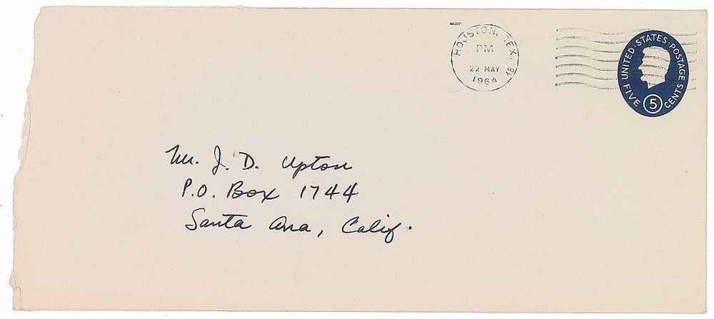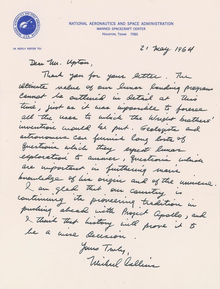 Desirable ALS, one page, 8 x 10.5, NASA letterhead, May 21, 1964. Letter to J. Duane Upton, in part: "The ultimate value of our lunar landing program cannot be outlined in detail at this time, just as it was impossible to foresee all the uses to which the Wright brothers' invention would be put. Geologists and astronomers can furnish long lists of questions which they expect lunar exploration to answer, questions which are important in furthering man's knowledge of his origin and of the universe. I am glad that our country is continuing its pioneering tradition in pushing ahead with Project Apollo, and I think that history will prove it to be a wise decision." Includes a glossy 4 x 5 black and white formal portrait of Collins wearing a suit and tie, signed in autopen, with reverse stamped: "Michael Collins, Captain, USAF, NASA Astronaut." In overall fine condition. Accompanied by the original mailing envelope, addressed in Collins's own hand. Along with fellow Apollo 11 crew-member Buzz Aldrin, Collins was selected as a member of the third group of NASA astronauts in October 1963. After serving as the backup pilot for Gemini 7, Collins earned his first flight assignment as the pilot of Gemini 10, which launched on July 18, 1966. Some eight years after President Kennedy's call for 'landing a man on the moon,' Collins served as the Command Module Pilot of the Columbia, leaving Neil Armstrong and Buzz Aldrin to land on the moon as he became the first to ever make a solo lunar orbit. Aboard the Columbia, Collins wrote in his log: 'I am alone now, truly alone, and absolutely isolated from any known life. I am it.'