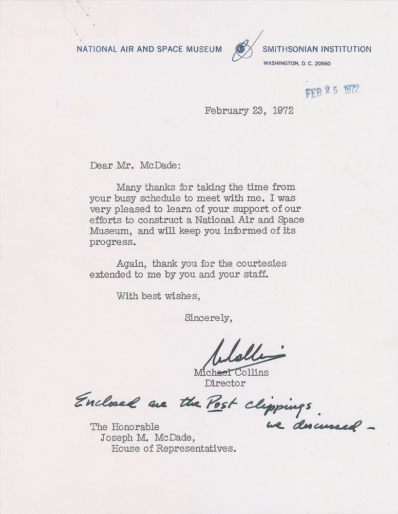 TLS signed "M. Collins," one page, 7 x 9, National Air and Space Museum letterhead, February 23, 1972. Letter of thanks to Congressman Joseph McDade, in full: "Many thanks for taking the time from your busy schedule to meet with me. I was very pleased to learn of your support of our efforts to construct a National Air and Space Museum, and I will keep you informed of its progress. Again, thank you for the courtesies extended to me by you and your staff." Collins also adds a short handwritten postscript which reads, "Enclosed are the Post clippings we discussed." In fine condition, with paperclip impression to top edge. Collins became director of the National Air and Space Museum in 1970, a position he held until 1978 when he was named undersecretary of the Smithsonian Institution.