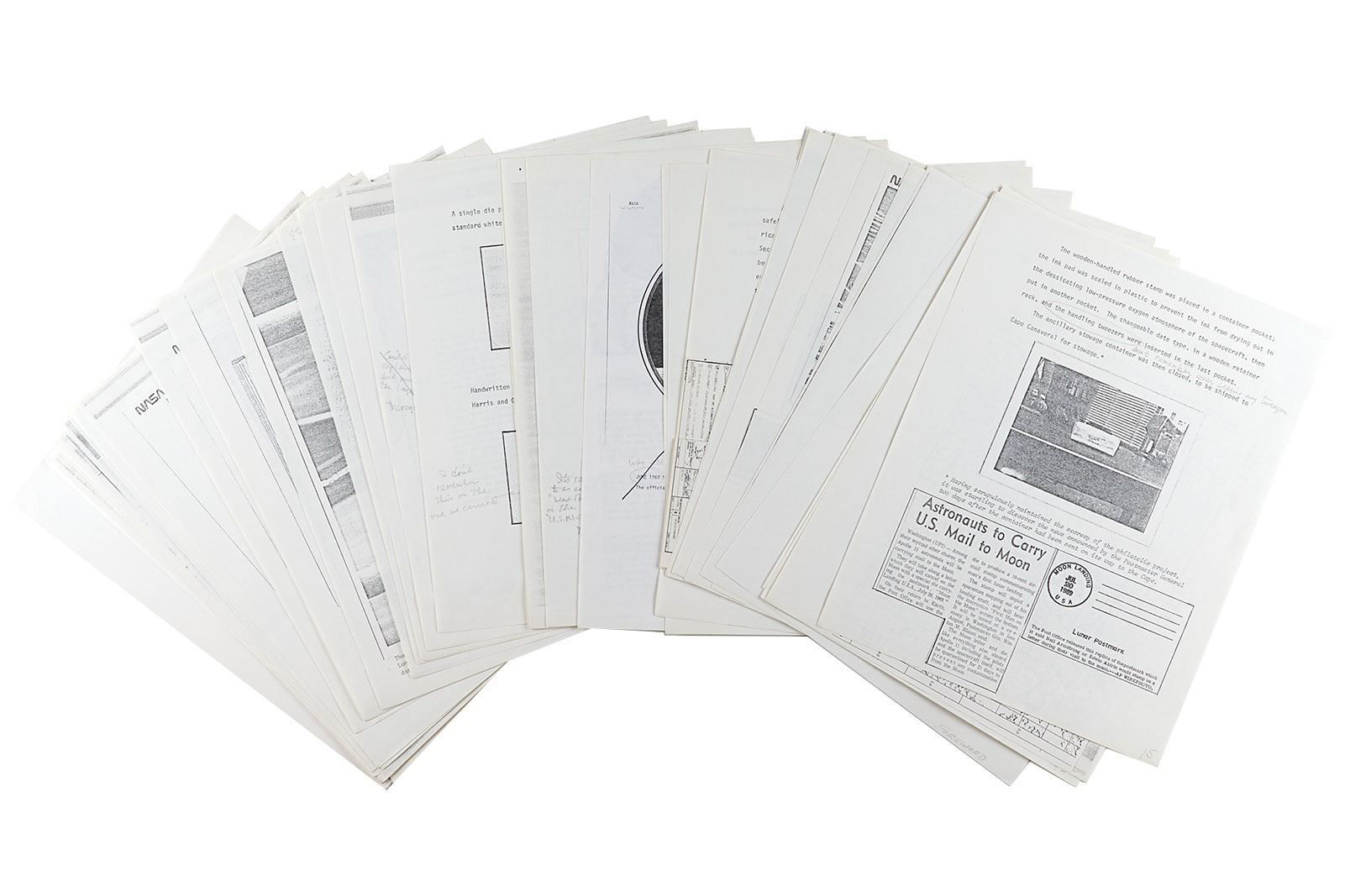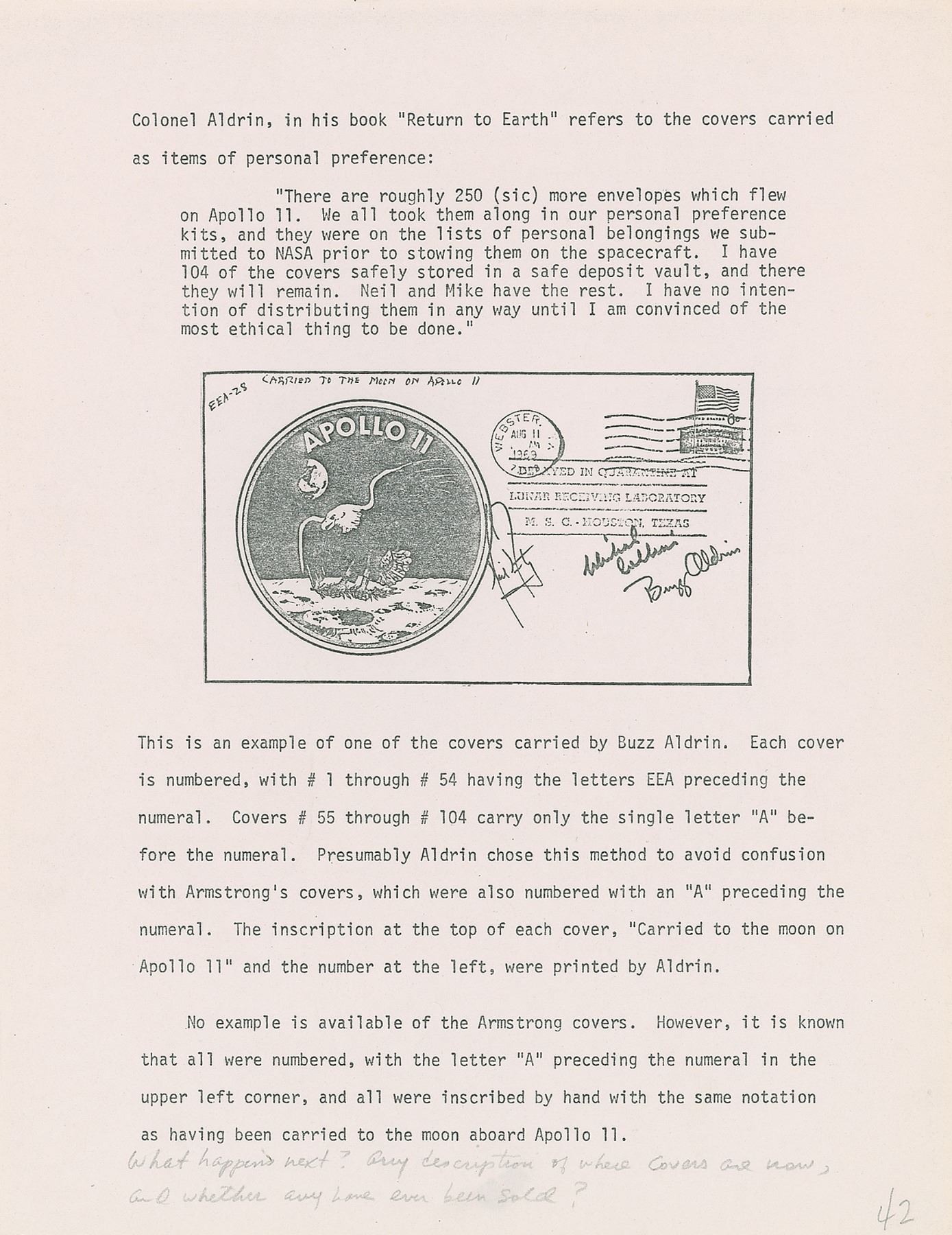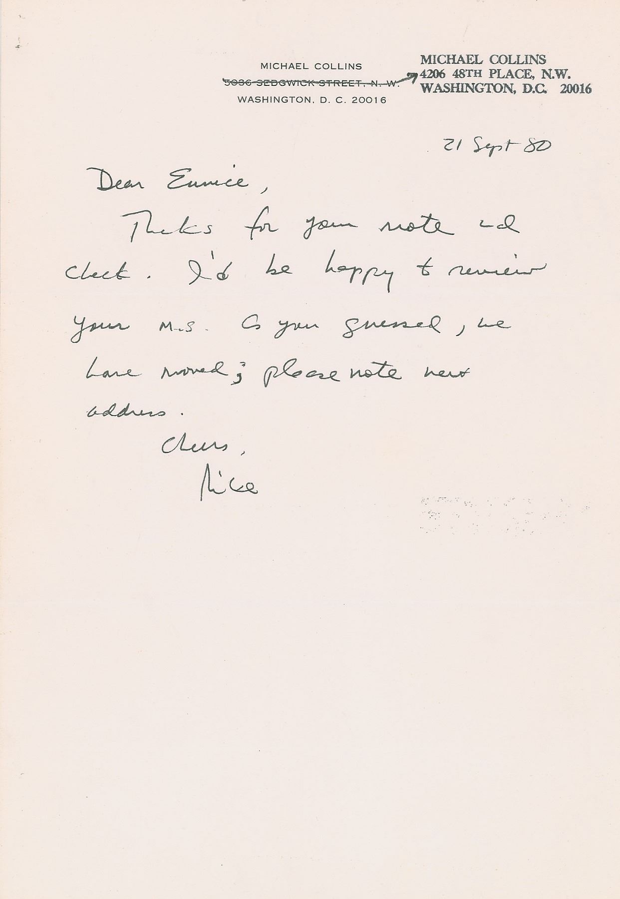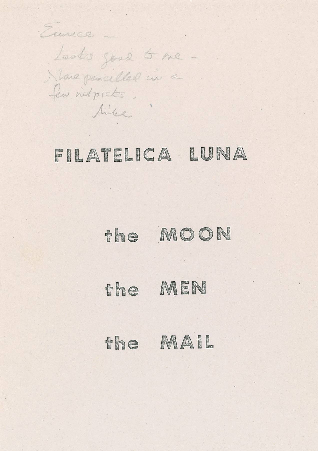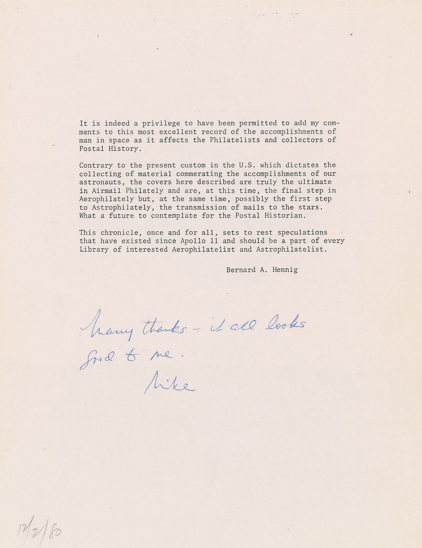 Manuscript for the unpublished book Filatelica Luna: The Moon, the Men, the Mail by Matthew and Eunice Radnofsky, NASA employees and presidents of the NASA Manned Spacecraft Center Stamp Club, 48 pages, 8.5 x 11, featuring several pencil handwritten notations and corrections by Collins. Includes a copy of the title page, with a note in pencil by Collins, "Eunice—Looks good to me—I have pencilled in a few nitpicks, Mike." Collins makes "nitpicks" in pencil to nine pages of the manuscript, for example: underlining 'West Point Military Academy,' and noting, "Its referred to as either 'West Point' or the 'U.S. Mil. Acad.," and "Ranks for Aldrin & Collins lead the reader to believe we are still on active duty. add 'at the time of the flt'?"; noting things that disagree with his memory—for example, tweezers in pockets, decks of playing cards, and the gold olive branch being "Buzz's project," not Neil's; and after the discussion of flown covers, inquiring, "What happens next? Any description of where covers are now, and whether any have been sold?" An additional prefatory page has been signed in blue ballpoint by Collins, "Many thanks—it all looks good to me. Mike." Also includes an ALS from Collins agreeing to read the manuscript, signed "Cheers, Mike," one page, 7.25 x 10.5, personal letterhead, September 21, 1980, in full: "Thanks for your note and check. I'd be happy to review your M.S. As you guessed, we have moved; please note new address." In overall fine condition.