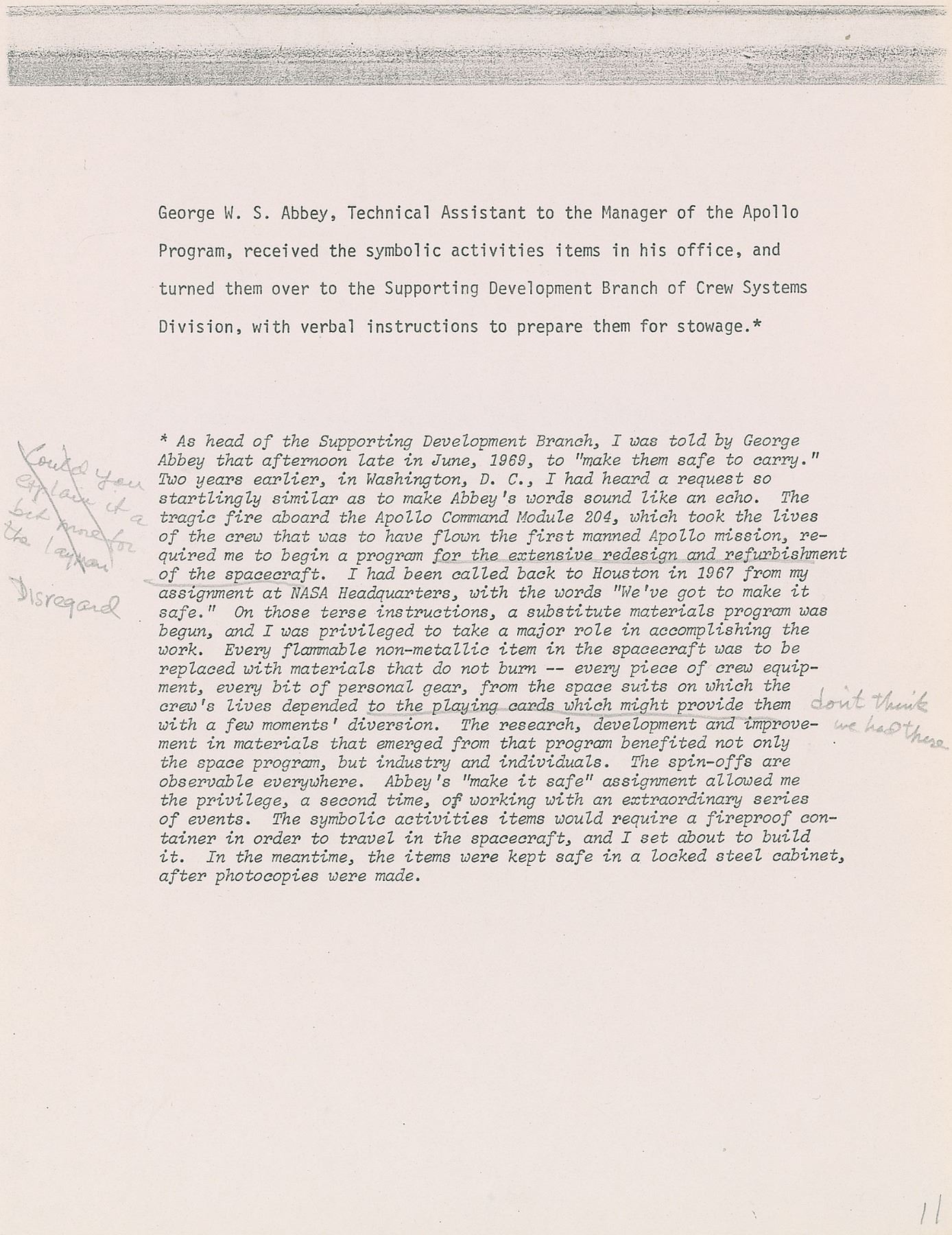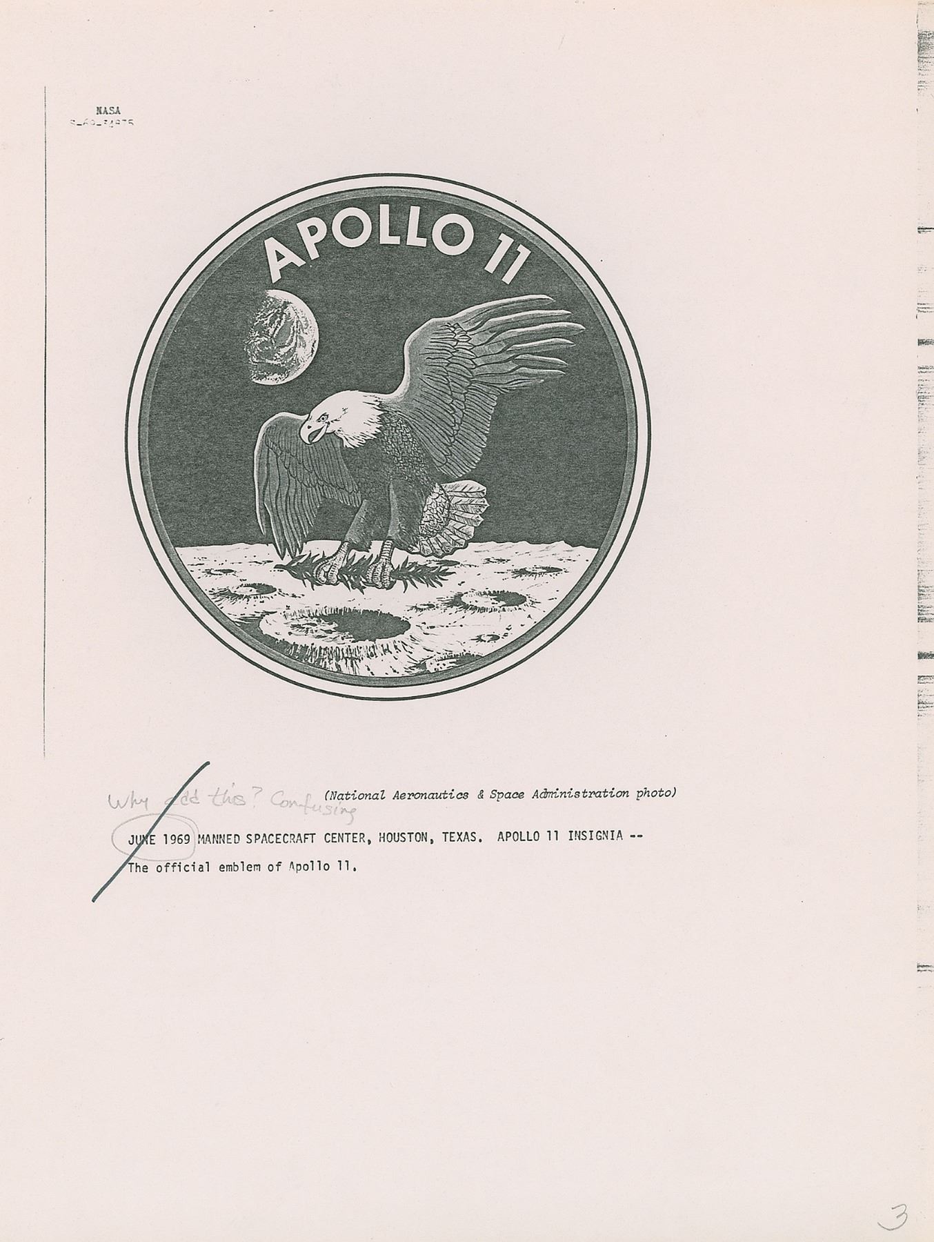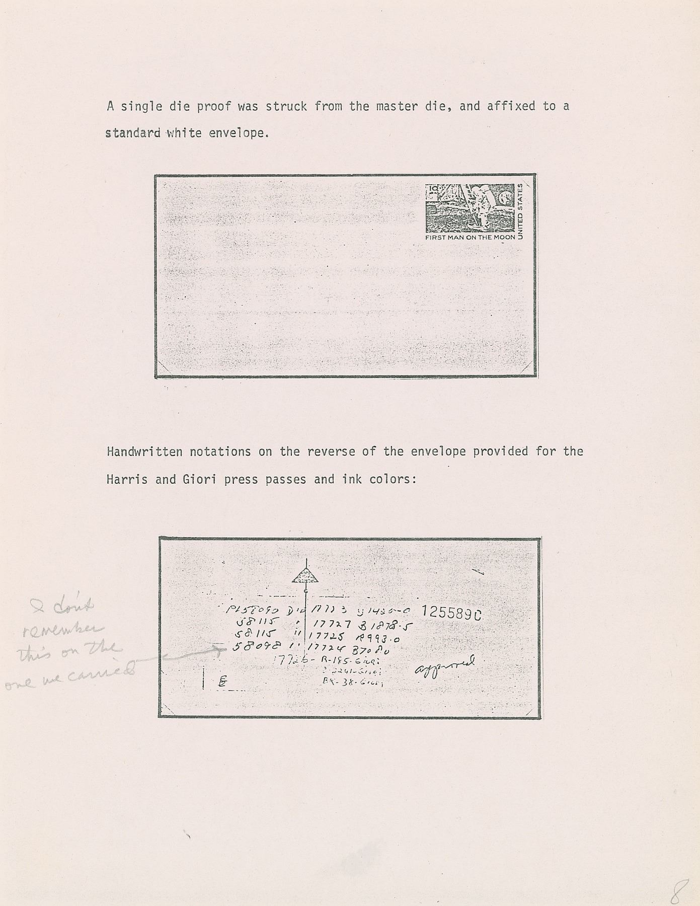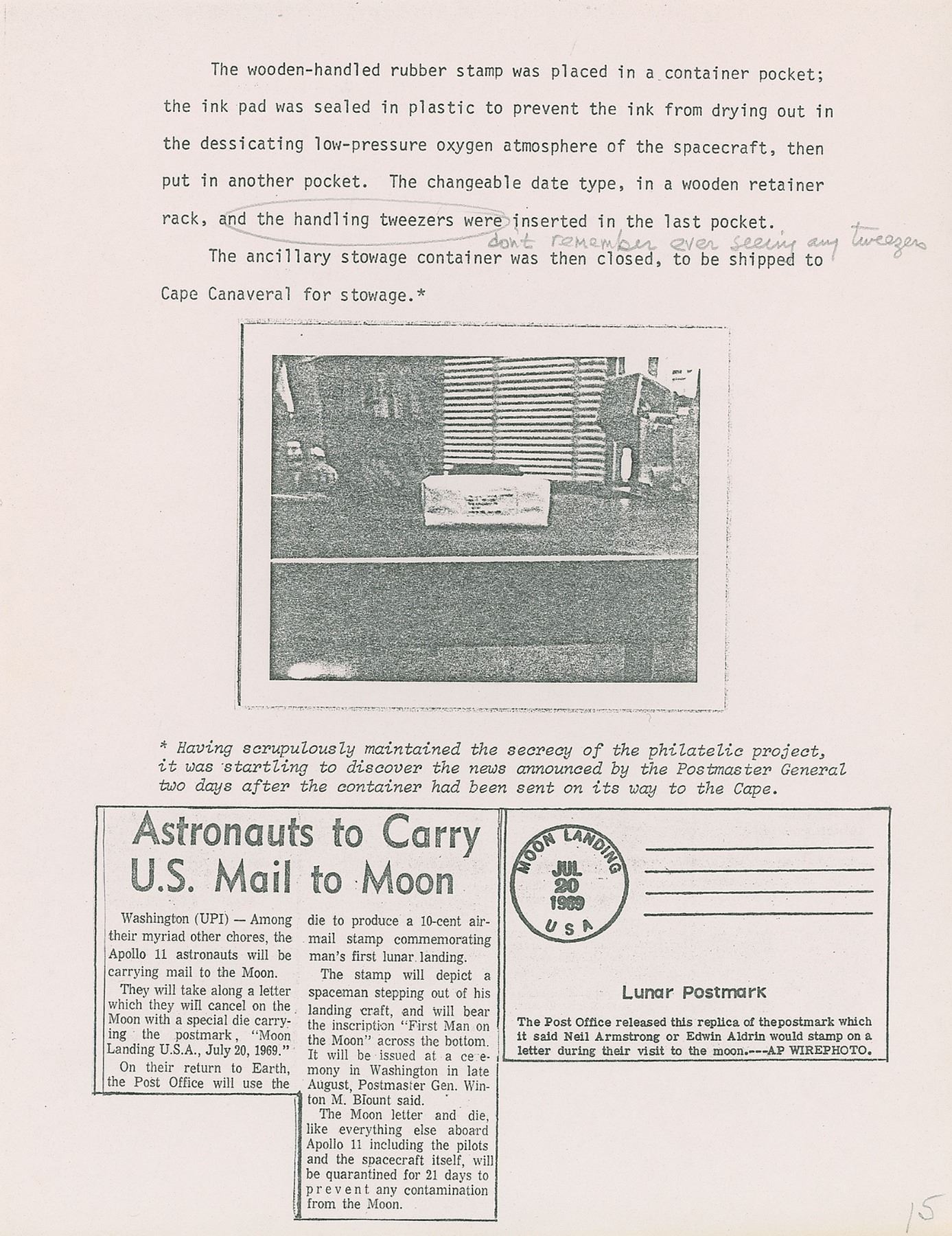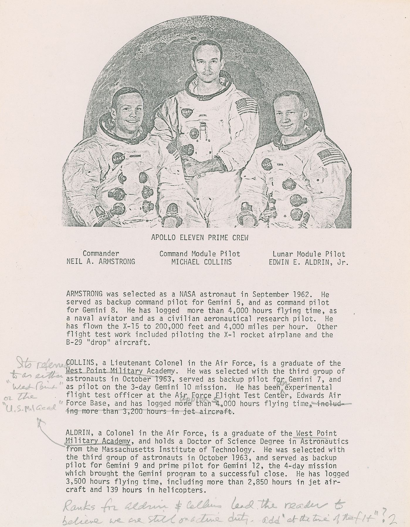 Manuscript for the unpublished book Filatelica Luna: The Moon, the Men, the Mail by Matthew and Eunice Radnofsky, NASA employees and presidents of the NASA Manned Spacecraft Center Stamp Club, 48 pages, 8.5 x 11, featuring several pencil handwritten notations and corrections by Collins. Includes a copy of the title page, with a note in pencil by Collins, "Eunice—Looks good to me—I have pencilled in a few nitpicks, Mike." Collins makes "nitpicks" in pencil to nine pages of the manuscript, for example: underlining 'West Point Military Academy,' and noting, "Its referred to as either 'West Point' or the 'U.S. Mil. Acad.," and "Ranks for Aldrin & Collins lead the reader to believe we are still on active duty. add 'at the time of the flt'?"; noting things that disagree with his memory—for example, tweezers in pockets, decks of playing cards, and the gold olive branch being "Buzz's project," not Neil's; and after the discussion of flown covers, inquiring, "What happens next? Any description of where covers are now, and whether any have been sold?" An additional prefatory page has been signed in blue ballpoint by Collins, "Many thanks—it all looks good to me. Mike." Also includes an ALS from Collins agreeing to read the manuscript, signed "Cheers, Mike," one page, 7.25 x 10.5, personal letterhead, September 21, 1980, in full: "Thanks for your note and check. I'd be happy to review your M.S. As you guessed, we have moved; please note new address." In overall fine condition.