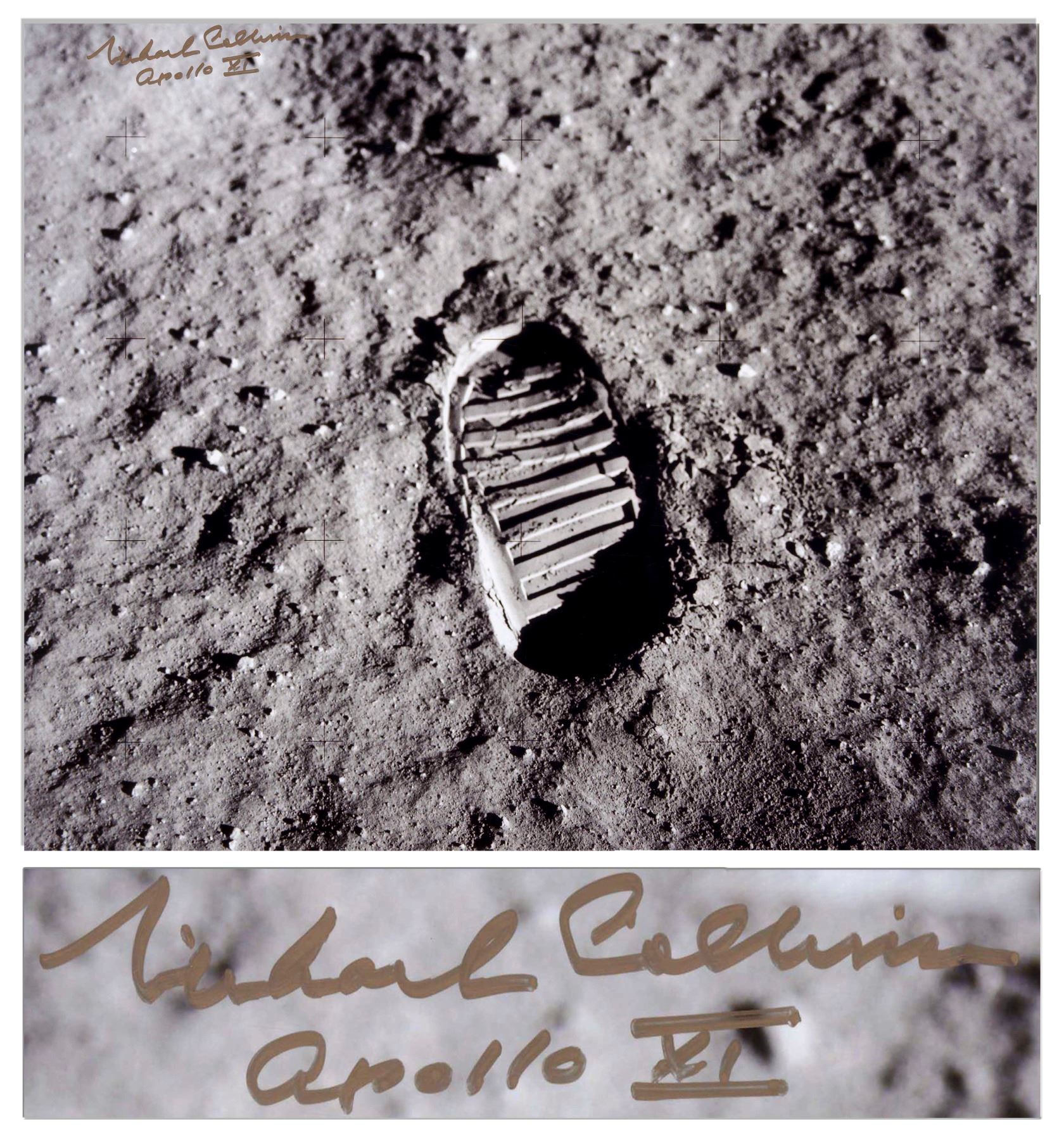 Michael Collins signed 20'' x 16'' photo showing Buzz Aldrin's footprint upon the moon, a curious impression revealing an almost powdery substance upon the surface. Collins signs dramatically in gold ink, ''Michael Collins / Apollo XI''. Glossy photo is near fine. Signature was obtained at Spacefest 2019.