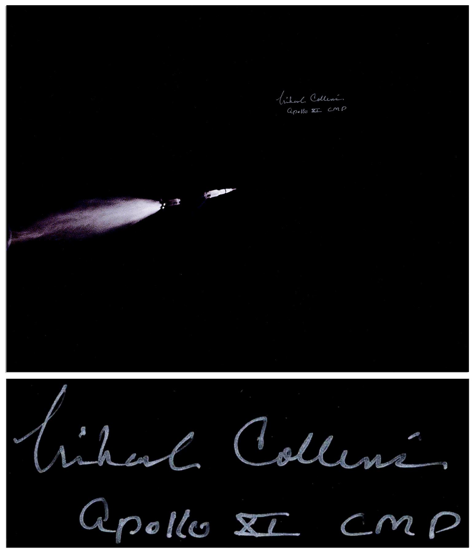 Michael Collins signed 20'' x 16'' photo taken on 16 July 1969 of the Apollo 11 Saturn V rocket during the first stage separation. Collins signs in silver ink against the black sky, ''Michael Collins / Apollo XI CMP''. Glossy photo is near fine. With Novaspace COA.