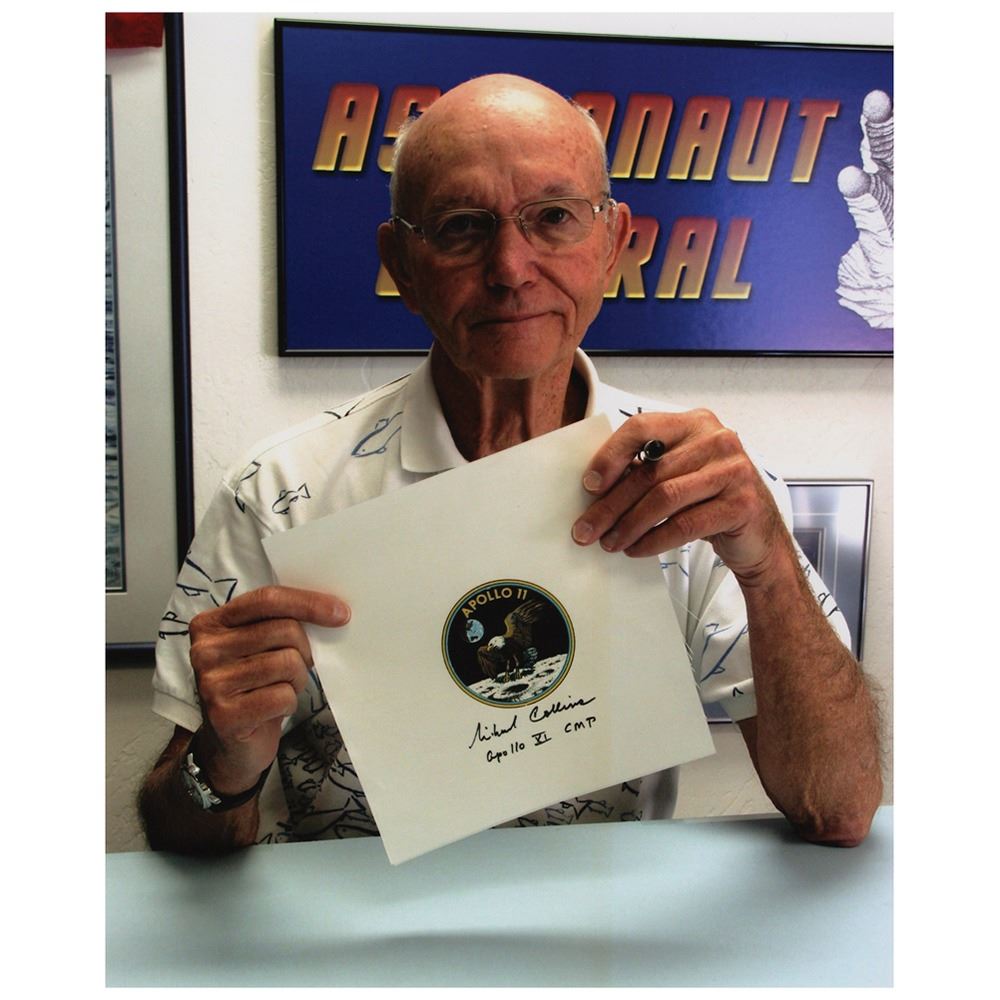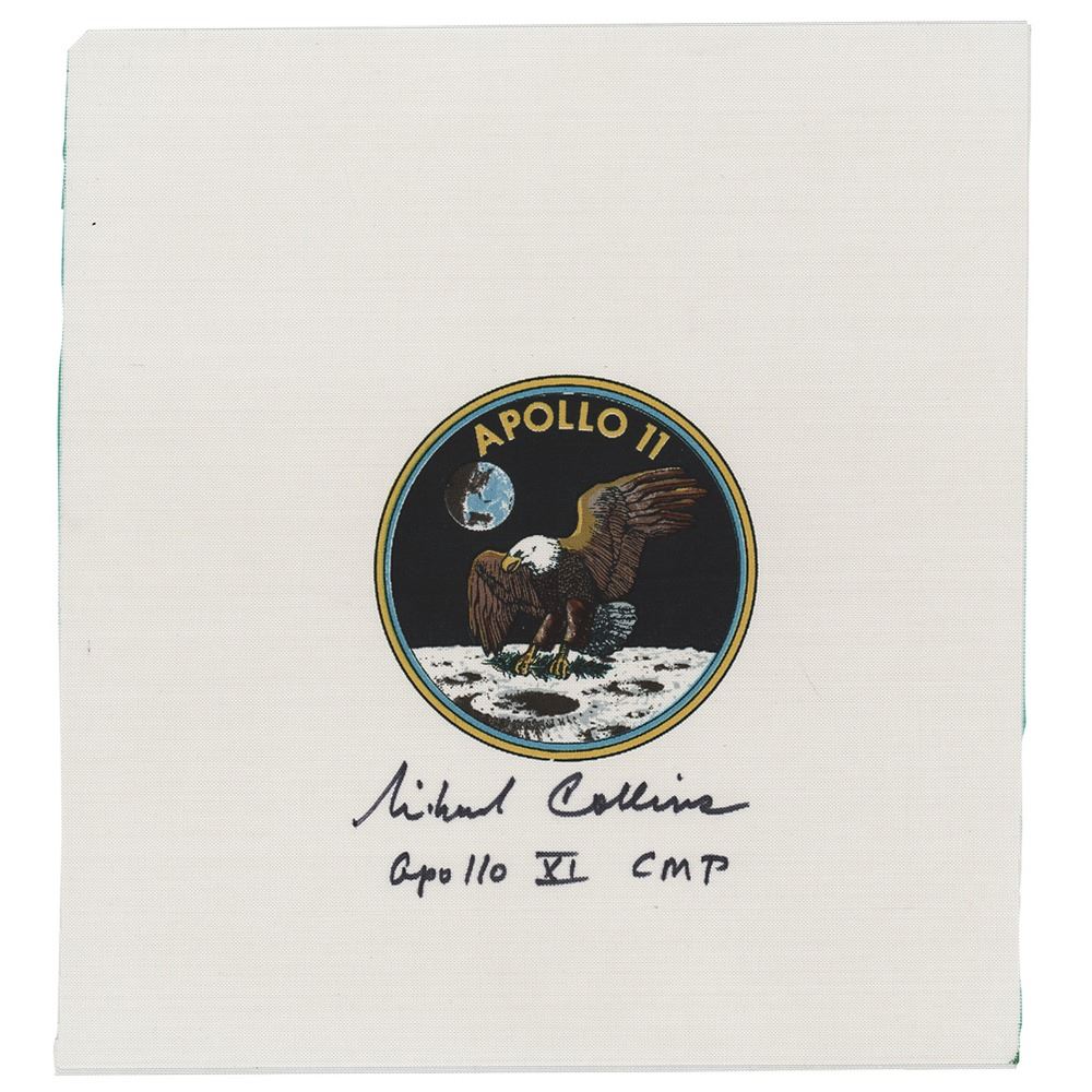An 8.5 x 9.25 swatch of Beta cloth bearing a central design of the Apollo 11 mission insignia, signed in black felt tip "Michael Collins, Apollo XI CMP." In very fine condition. Accompanied by a photograph of Collins holding this piece at an Astronaut Central private signing.