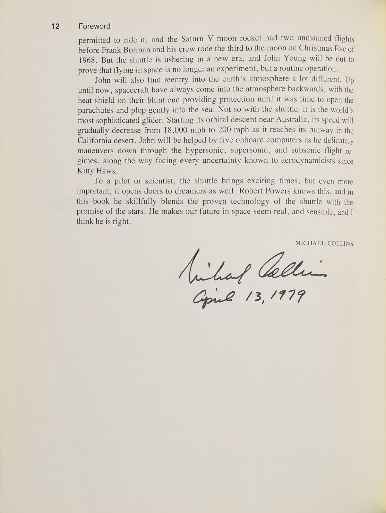 Signed book: The World's First Spaceship: Shuttle. First edition. Harrisburg, PA: Stackpole Books, 1979. Hardcover with dust jacket, 7.75 x 9.5, 255 pages. Signed at the end of the foreword in black felt tip, "Michael Collins, April 13, 1979." In fine condition, with wear and small edge tears to the dust jacket.