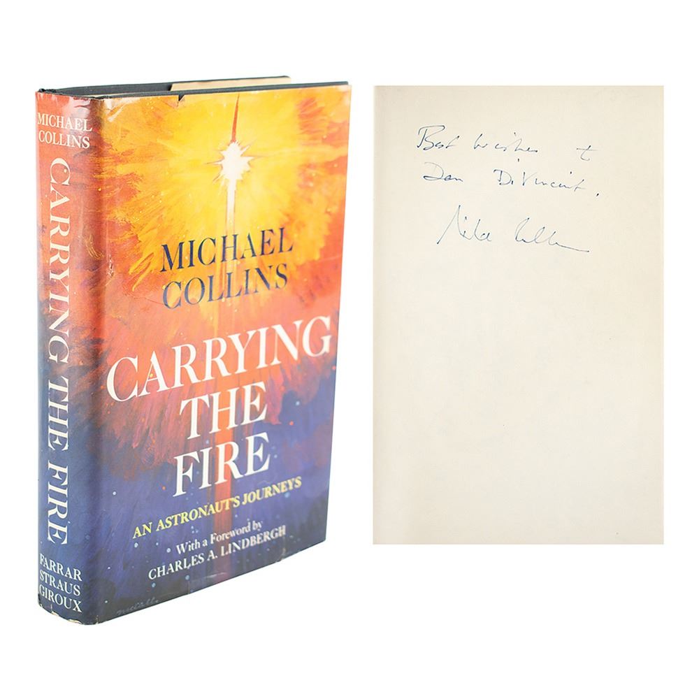 Signed book: Carrying the Fore: An Astronaut's Journeys. Third printing. NY: Farrar, Straus and Giroux, 1974. Hardcover with dust jacket, 6.25 x 9.25, 478 pages. Signed and inscribed on the first free end page in black ink, "Best wishes to Dan DiVincent, Mike Collins." In fine condition.