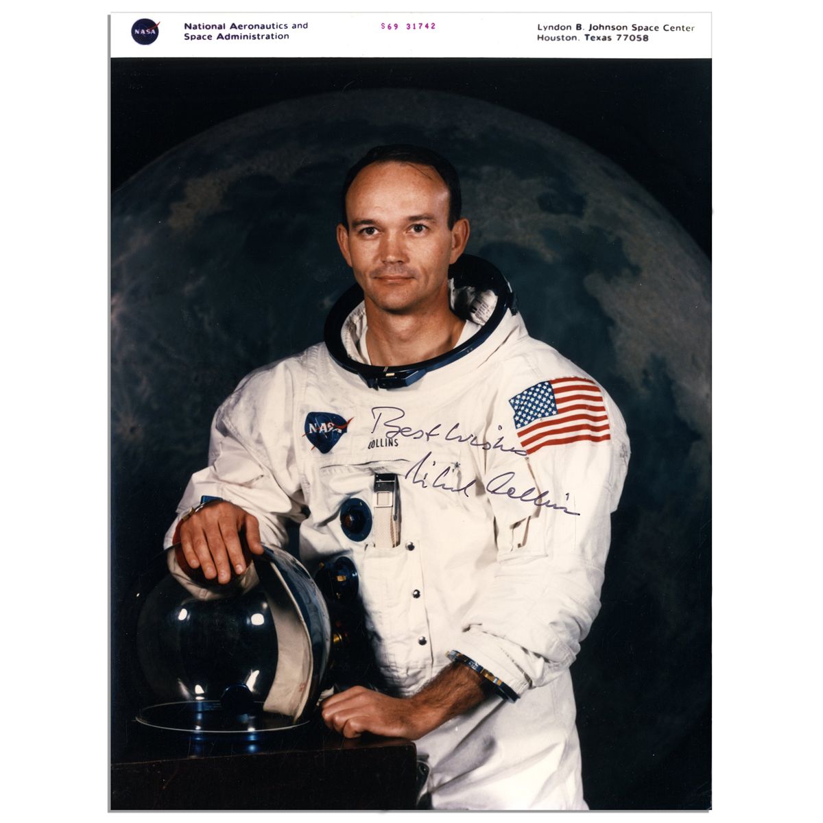 Michael Collins Signed NASA 8'' x 10'' Photo -- ''Best Wishes / Michael Collins'' -- With NASA Backstamp -- Near Fine