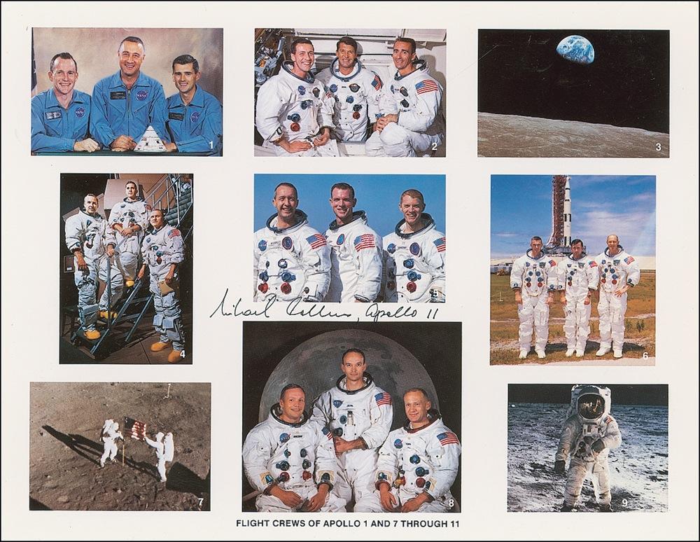 Color 11 x 8.5 cardstock composite photo of the flight crews of Apollo 1 and Apollo 7 through 11, signed in black ink, “Michael Collins, Apollo 11.” In fine condition, with a few small corner tip dings. Pre-certified Scott Cornish and RRAuction COA. Near fine condition.
