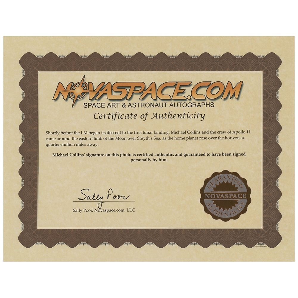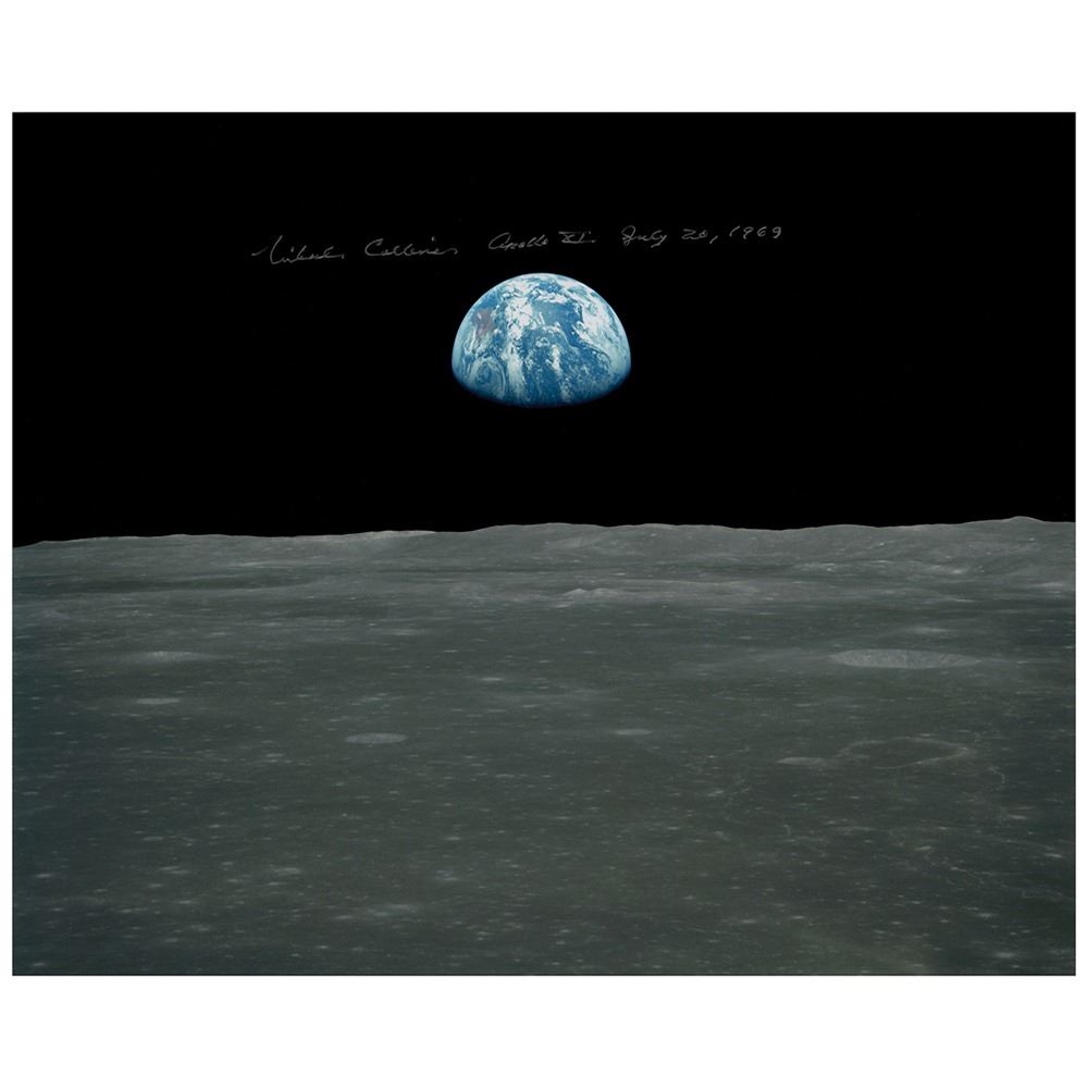 Color satin-finish 20 x 16 photo of Earth as seen over the lunar surface during the Apollo 11 mission, signed in silver ink, "Michael Collins, Apollo XI, July 20, 1969." In fine condition. Accompanied by a certificate of authenticity from Novaspace.