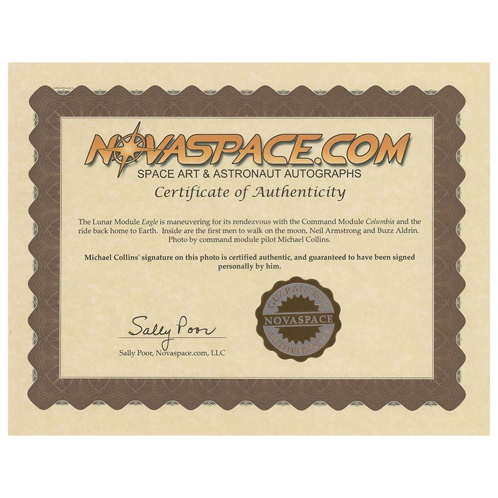 Color satin-finish 20 x 16 photo of the Lunar Module Eagle high above the lunar surface with the Earth visible in the background, signed in silver ink, "Michael Collins, Apollo XI CMP." In very fine condition. Accompanied by a certificate of authenticity from Novaspace.