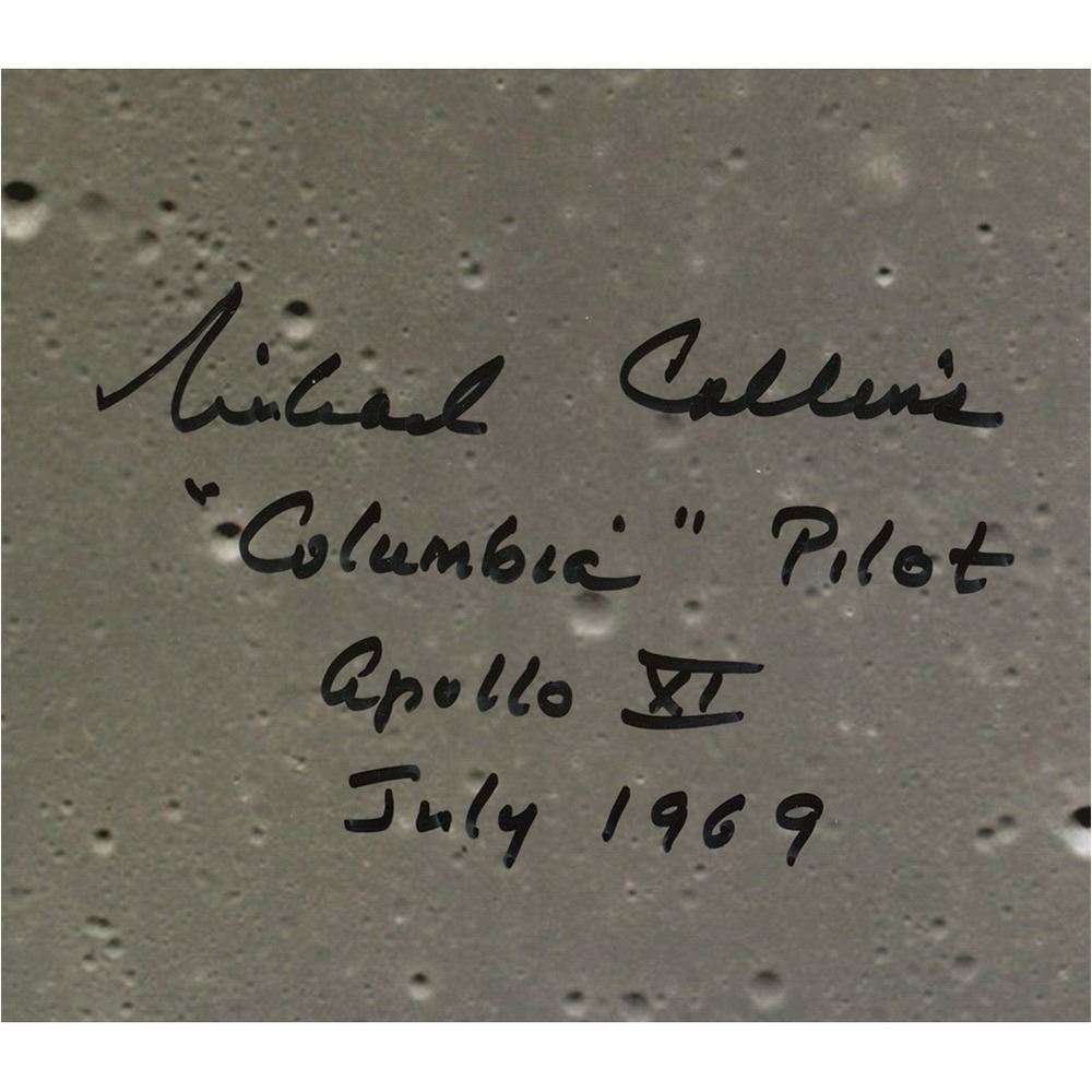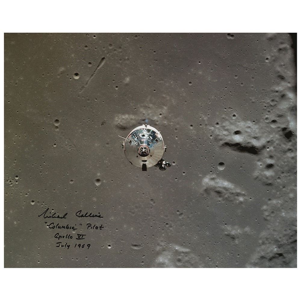 Color satin-finish 20 x 16 photo of the Command Module Columbia soaring high above the lunar surface during the Apollo 11 mission, signed in black felt tip, "Michael Collins, 'Columbia' Pilot, Apollo XI, July 1969." In fine condition.