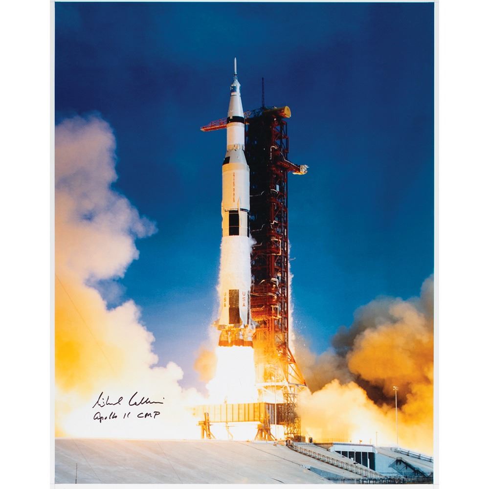 Impressive color satin-finish 16.5 x 20.75 photo of the historic launch of the Apollo 11 lunar-landing mission, signed in black felt tip, "Michael Collins, Apollo 11 CMP." In fine condition, with a few small surface creases. Accompanied by a certificate of authenticity from Moonpans.