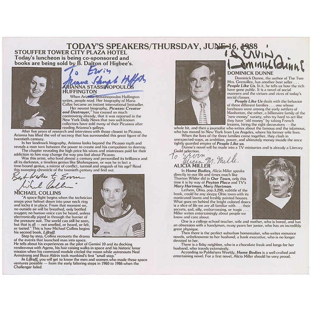 Pamphlet for The Plain Dealer Book & Author Luncheon in the spring of 1988, measuring 11 x 8.5 open, highlighting the four authors scheduled to speak on June 16 at the Stouffer Tower City Plaza Hotel, signed and inscribed above his bio in black ink, “Best Wishes to Ervin, Michael Collins.†Also signed and inscribed by Arianna Stassinopoulos Huffington, Dominick Dunne, and Alicia Miller. In fine condition.