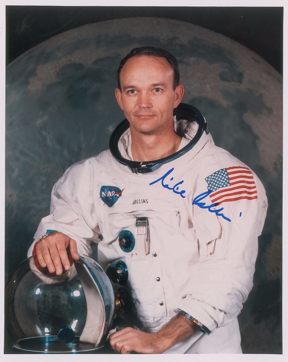 Color satin-finish 8 x 10 photo of Collins posing in his white spacesuit, signed in blue felt tip, “Mike Collins.” In fine condition.