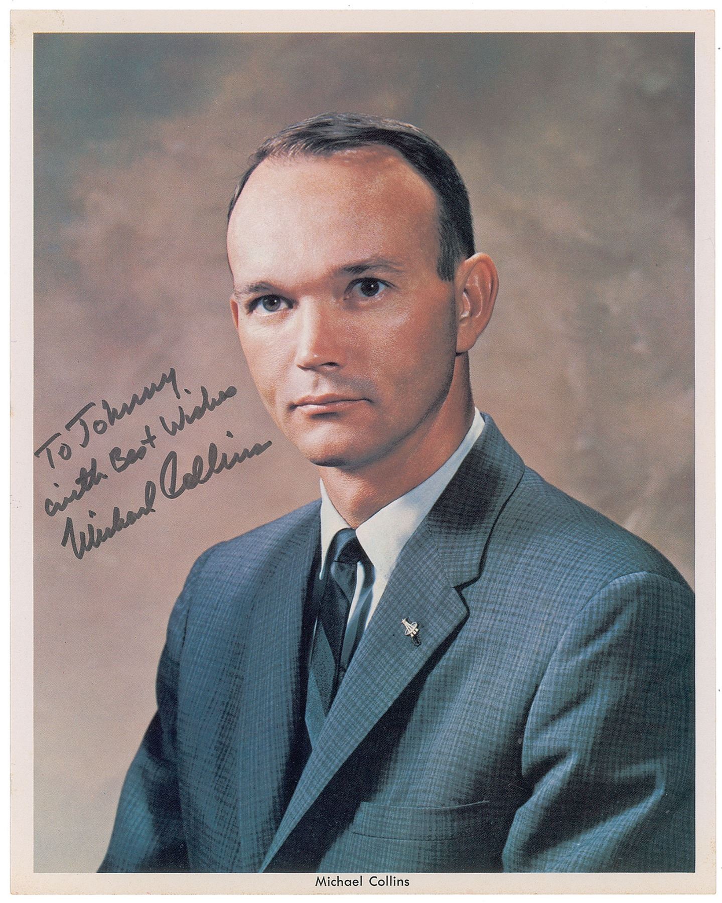 Official color 8 x 10 NASA lithograph of the Apollo 11 command module pilot, signed and inscribed in black felt tip, "To Johnny, with best wishes, Michael Collins.” In very fine condition. An early portrait of the second man to fly solo around the moon.