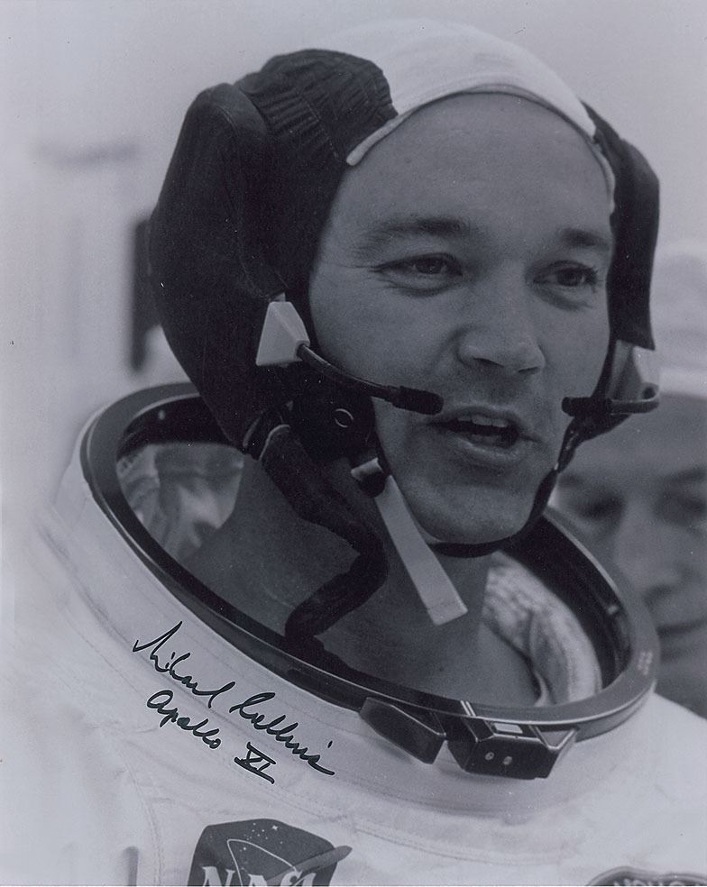 Satin-finish 8 x 10 close-up photo of the Apollo 11 command module pilot wearing his space suit, signed in black felt tip, "Michael Collins, Apollo XI." In very fine condition.