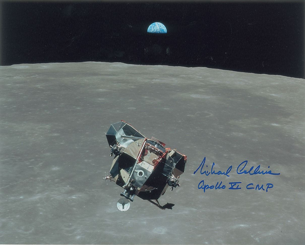 Color semi-glossy 10 x 8 photo of the Apollo 11 lunar module rising above the moon with a crescent Earth in the distance, signed in blue felt tip, "Michael Collins, Apollo XI CMP." In very fine condition.