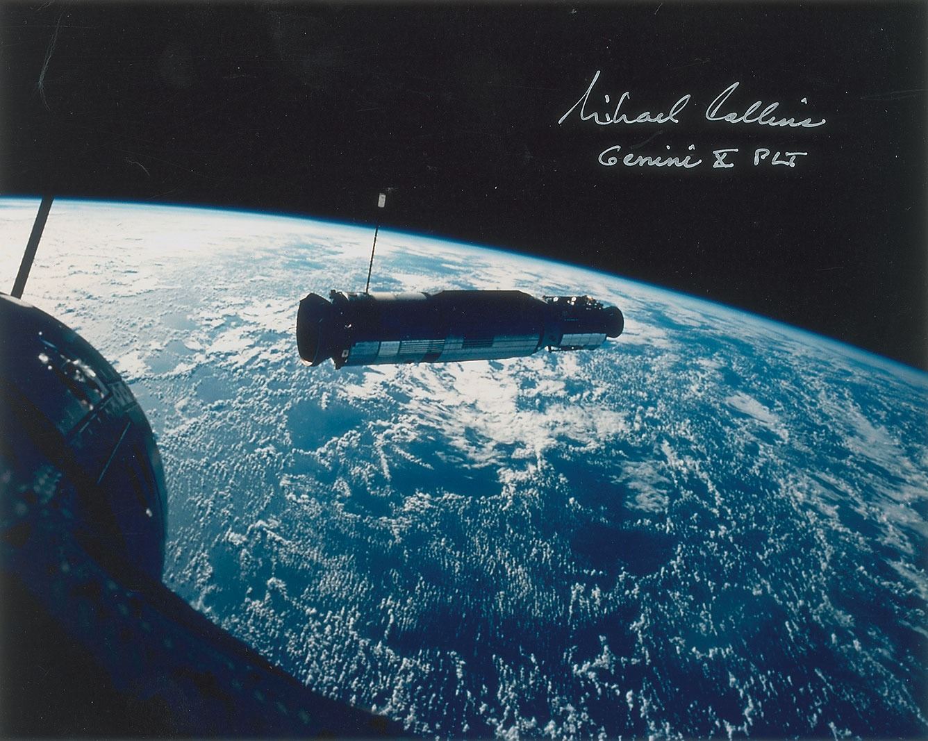 Color semi-glossy 10 x 8 photo of the Agena Target Vehicle during rendezvous with the Gemini spacecraft, signed in silver felt tip, "Michael Collins, Gemini X PLT." In very good to fine condition, with creasing to the upper left corner.