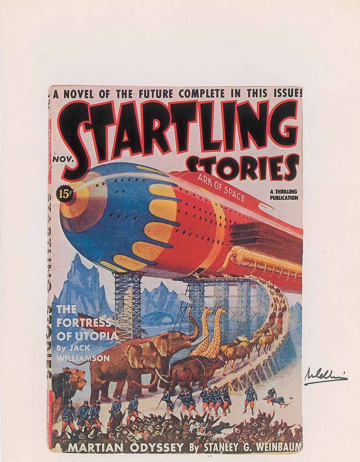 Excellent color semi-glossy 8.5 x 11 paperstock photo of the cover to the November 1939 issue of Startling Stories, signed in black ink, "M. Collins." In fine condition.