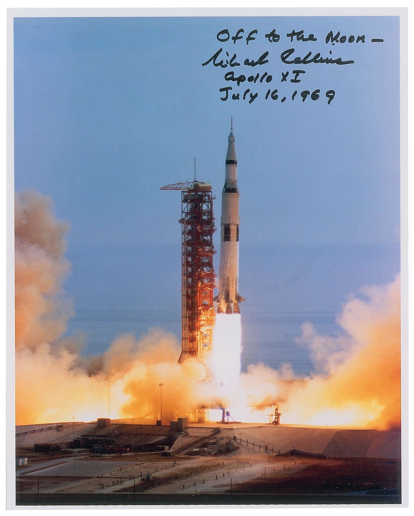 Scarce color glossy 8 x 10 photo of the fiery and historic launch of the Apollo 11 mission, signed in black felt tip, "Off to the moon—Michael Collins, Apollo XI, July 16, 1969." In very fine condition. A vibrant, uncommon image elevated by a fantastic autograph from the mission's CMP.