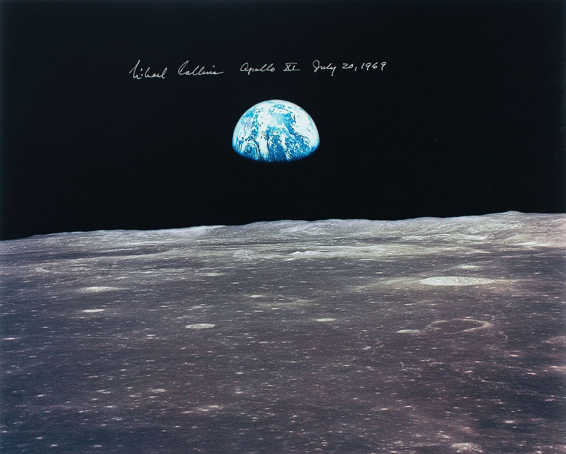 Beautiful color satin-finish 20 x 16 photo of the Earth hanging over the glowing lunar landscape, signed in silver ink, "Michael Collins, Apollo XI, July 20, 1969." In fine condition.