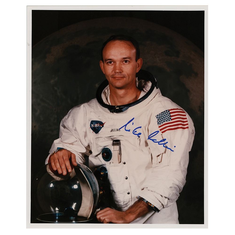 Color satin-finish 8 x 10 photo of Michael Collins posing in his white space suit against a lunar backdrop, signed in blue felt tip. In fine condition, with a few small surface creases.