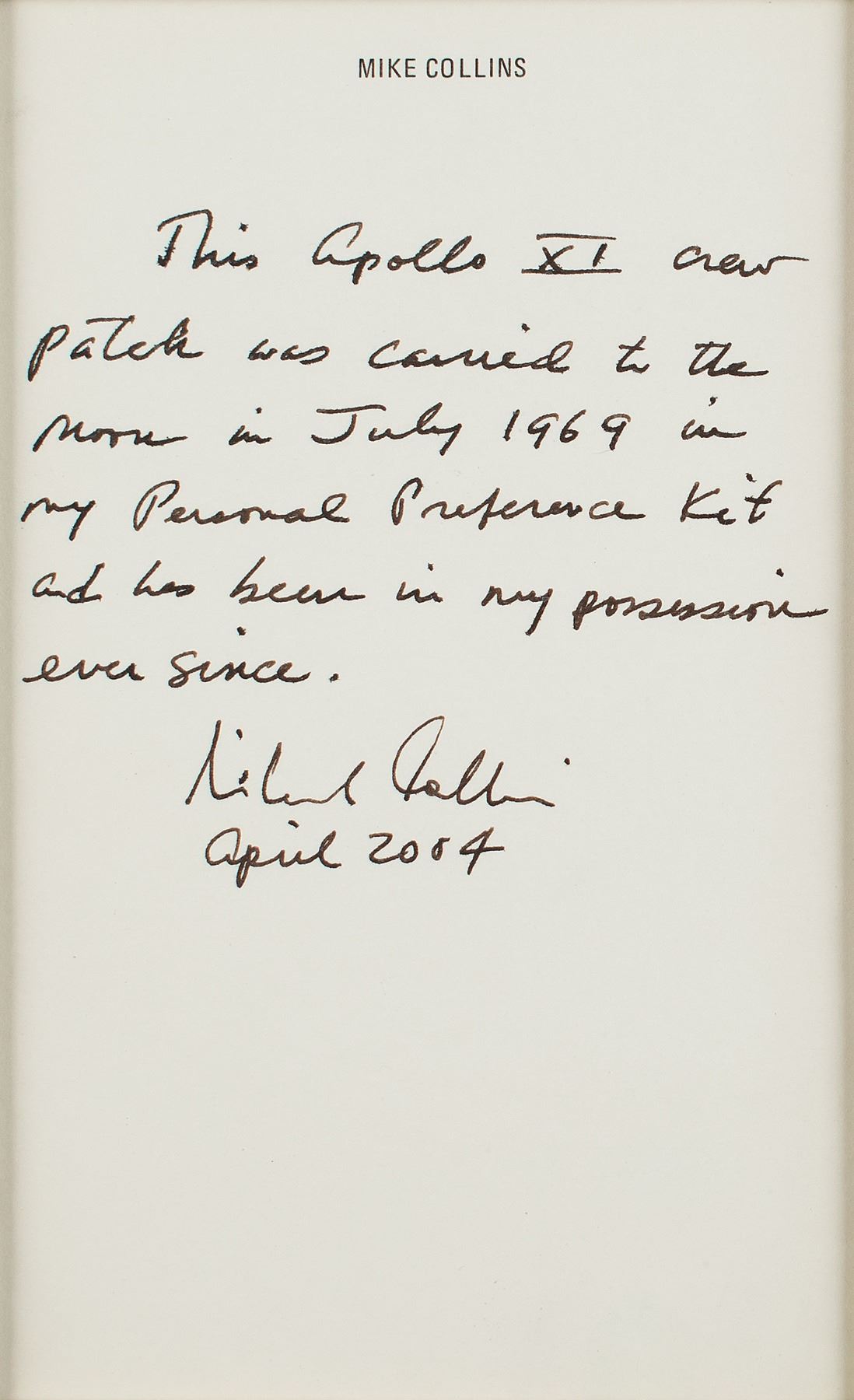 Michael Collins's exceptional flown 5.5 x 5.5 swatch of Beta cloth featuring the Apollo 11 insignia carried to the moon during the first lunar-landing mission, signed and flight-certified in black felt tip, "Carried to the Moon aboard Apollo XI, July 1969, Michael Collins," and also signed by his crewmates, "Neil Armstrong" and "Buzz Aldrin." Handsomely double-matted and framed beside a handwritten letter of provenance signed by Collins, dated April 2004, in full: "This Apollo XI crew patch was carried to the moon in July 1969 in my personal preference kit and has been in my possession ever since." In fine condition. A superb flown format fully signed by the first lunar landing crew, boasting excellent provenance from the collection of the CMP. An attractively displayed, spectacular piece of space history.