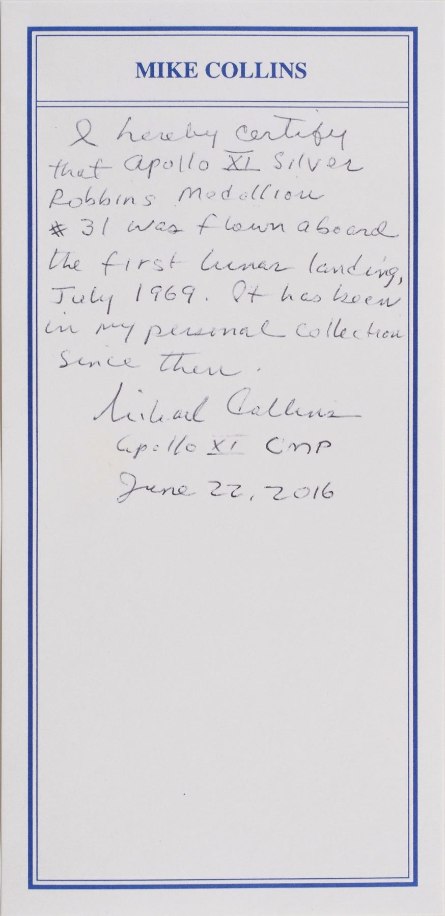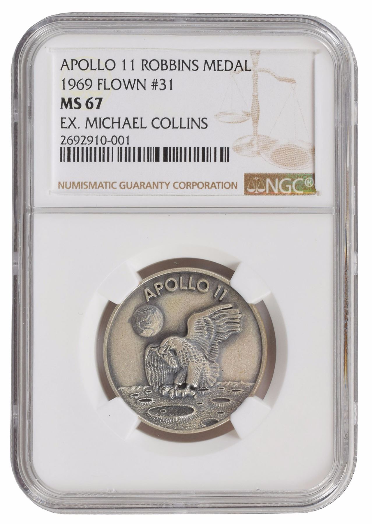 Historic flown sterling silver Apollo 11 Robbins medal, approximately 1.25? diameter, with a raised early design on the face of the iconic Apollo 11 mission insignia, with the eagle carrying the olive branch in its beak. The reverse of the sterling silver medal is engraved with the last names of astronauts Neil Armstrong, Buzz Aldrin, and Michael Collins, along with the July 16, 1969, launch date; July 20, 1969, moon landing date; and July 24, 1969, return date. This medal is serial numbered "31." Encapsulated in a plastic NGC holder, certifying it as being from the collection of Michael Collins and evaluating it as "MS67." Includes an ALS signed "Michael Collins, Apollo XI CMP," dated June 22, 2016, in full: "I hereby certify that Apollo XI silver Robbins medallion #31 was flown aboard the first lunar landing, July 1969. It has been in my personal collection since then." A superb and beautiful example of the most sought-after Robbins medallion, which also features one of the lowest serial numbers recorded. Flown medallions from the personal collection of an astronaut, with handwritten certification, are the most desirable to be found.