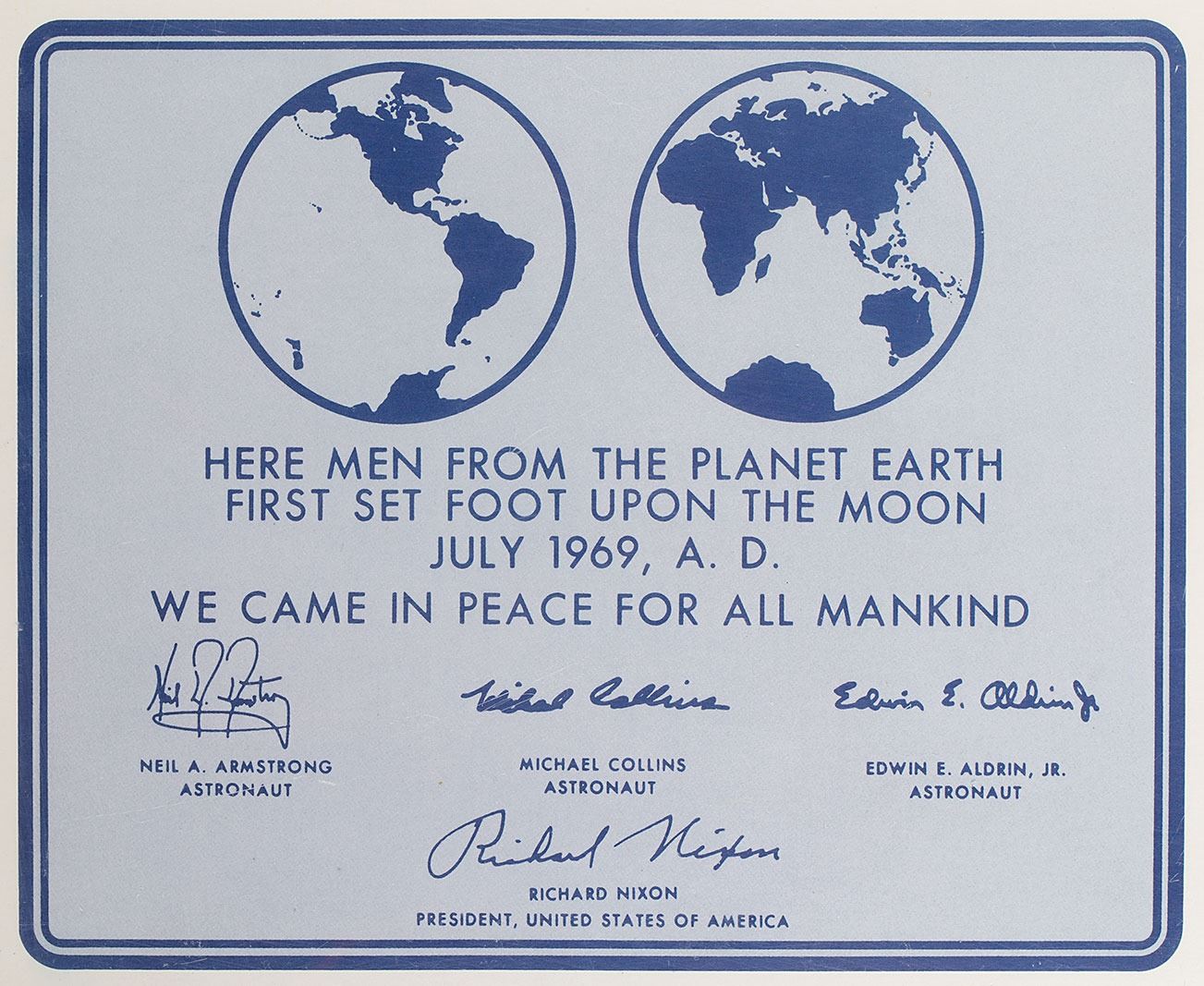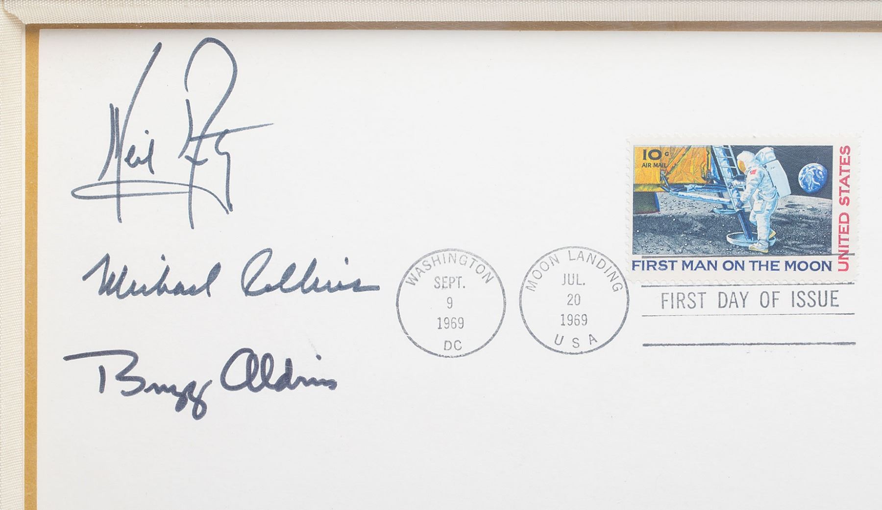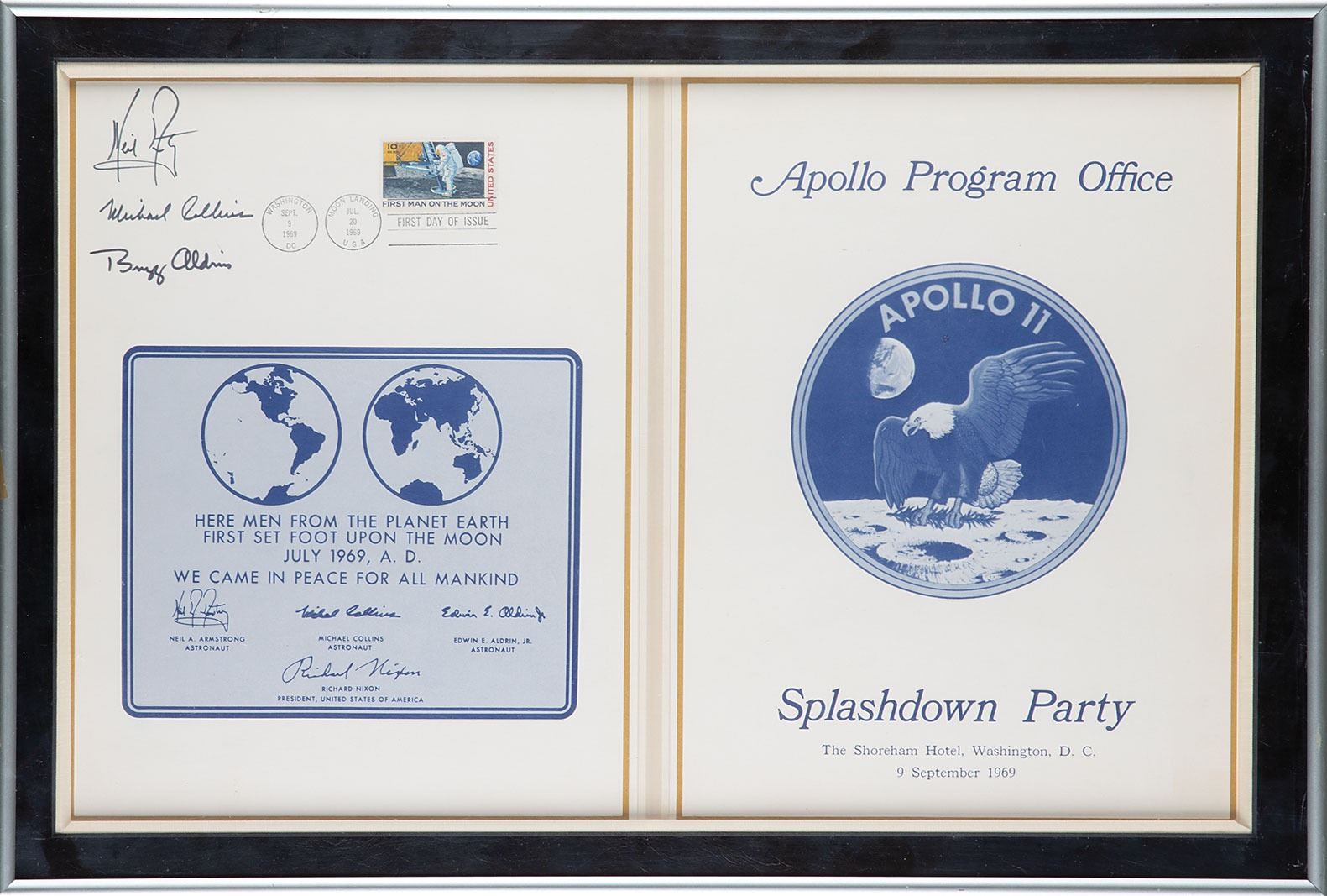 Michael Collins's personally-owned program for the Apollo 11 "Splashdown Party" held at The Shoreham Hotel in Washington, DC, on September 9, 1969, opened to an overall size of 19 x 12, signed on the back cover in black felt tip by Neil Armstrong, Michael Collins, and Buzz Aldrin. To the right of the signatures is an affixed 'First Man on the Moon' postage stamp with first day cancelation. The front cover reproduces the Apollo 11 mission insignia, and the back cover reproduces the plaque left behind on the lunar surface. Nicely matted and framed to an overall size of 21.75 x 14.75. In fine condition. Accompanied by the original bill of sale from Peachstate Historical Consulting, noting the provenance as "The Michael Collins Space Collection." A superb piece boasting bold, clean signatures of the complete Apollo 11 crew.