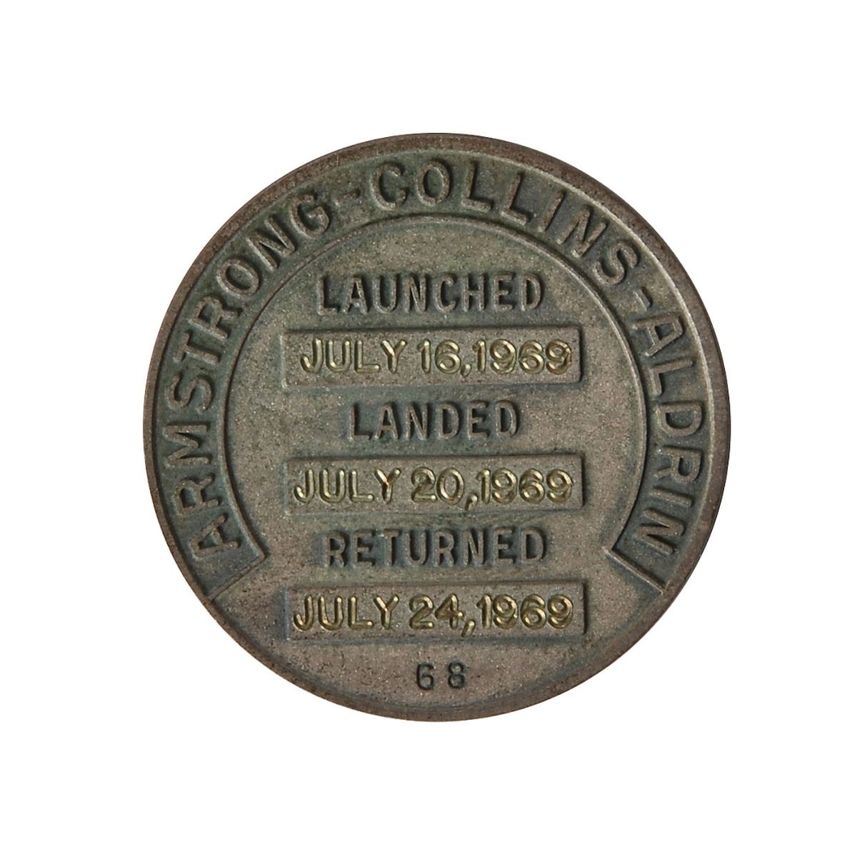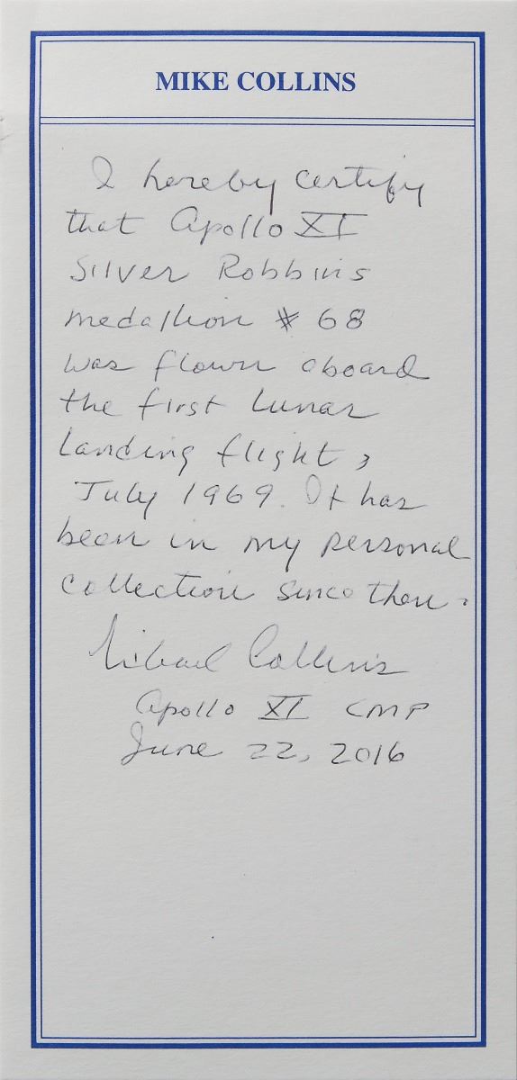 Michael Collins’s flown sterling silver Apollo 11 Robbins Medal, approximately 1? in diameter, with a raised early design on the face of the iconic Apollo 11 mission insignia, with the eagle carrying the olive branch in its beak. The reverse of the sterling silver medal is engraved with the last names of astronauts Neil Armstrong, Buzz Aldrin, and Michael Collins, along with the July 16, 1969, launch date; July 20, 1969, moon landing date; and July 24, 1969, return date. Condition is mint state. The medal is serial numbered “68,” and encapsulated in a plastic NGC holder with a grade of MS65 and provenance certification, “Ex. Michael Collins.” Accompanied by a handwritten letter of provenance from Collins, in full: “I hereby certify that Apollo XI silver Robbins medallion #68 was flown aboard the first Lunar Landing flight, July 1969. It has been in my personal collection since then. Michael Collins, Apollo XI CMP, June 22, 2016.” Remarkably scarce flown mementos such as this—particularly one from man’s first step into a brave new world—are highly prized by collectors, with this being an especially appealing example as it originates from the personal collection of the mission’s command module pilot and is of such an uncommonly low serial number.