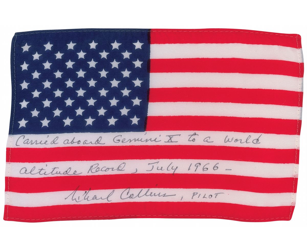Flown American flag carried on the Gemini 10 mission, 6 x 4, signed and flight-certified in black ink, “Carried aboard Gemini X to a world altitude record, July 1966—Michael Collins, Pilot.” In fine condition. An exceptional flown flag from Collins’s first space flight, a journey that took him a record-breaking 756 kilometers above Earth.