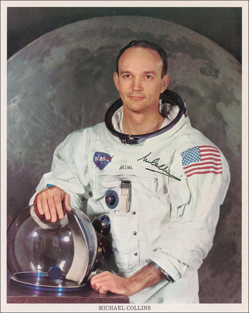Color 8 x 10 NASA photo of Collins posing in his flight suit against a lunar background, signed in black felt tip. In very fine condition.