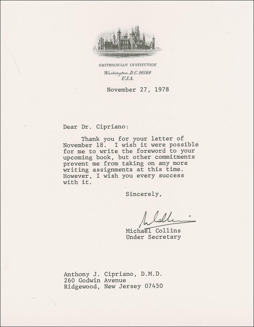 TLS, one page, 7 x 9, Smithsonian Institute letterhead, November 27, 1978. Letter to Dr. Anthony Cipriano. In full: "Thank you for your letter of November 8, I wish it were possible for me to write the foreword to your upcoming book, but other commitments prevent me from taking on any more writing assignments at this time. However, I wish you every success with it.” In fine condition. Dr. Cipriano, a member of the National Space Institute and the American Institute of Aeronautics and Astronautics, is the author of “America’s Journeys Into Space: The Astronauts of the United States.” The foreword to his book was written by Astronaut Gordon Cooper.