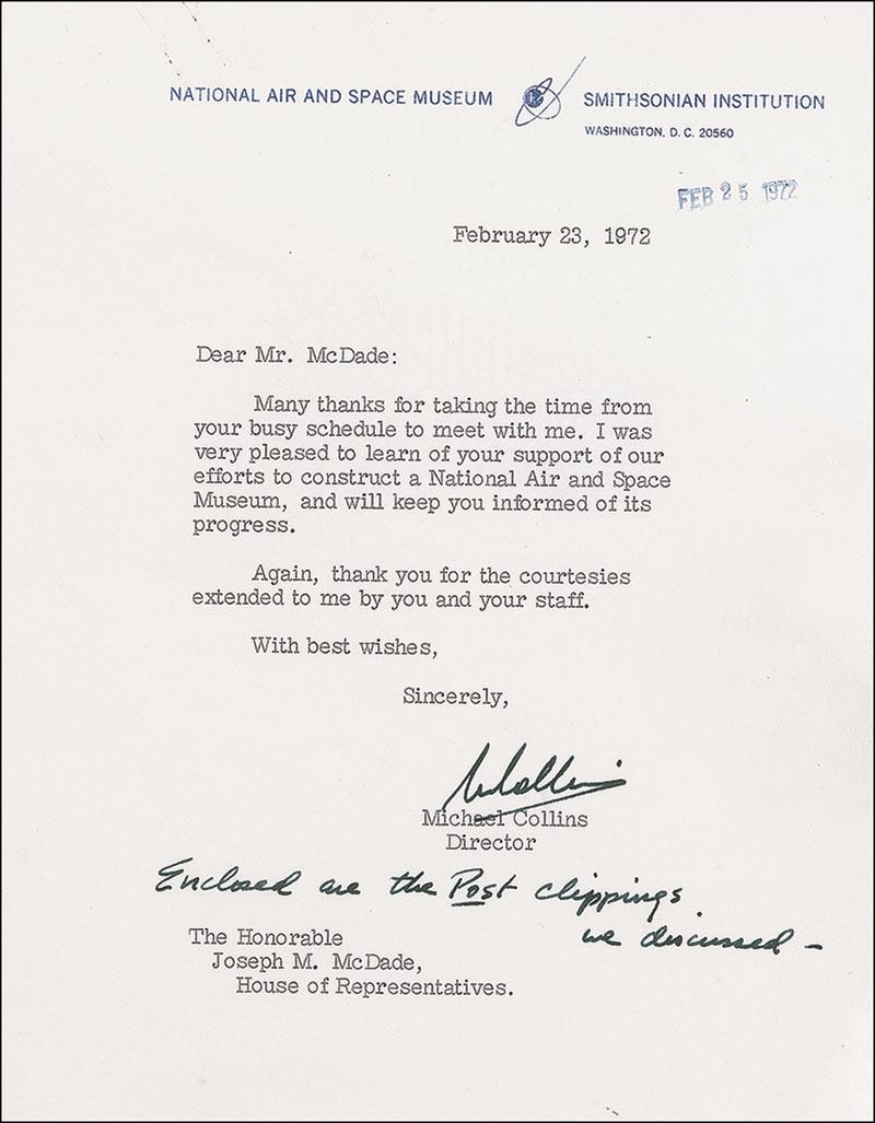 TLS signed “M. Collins,” one page, 7 x 9, National Air and Space Museum letterhead, February 23, 1972. Letter of thanks to Congressman Joseph McDade. In full: “Many thanks for taking the time from your busy schedule to meet with me. I was very pleased to learn of your support of our efforts to construct a National Air and Space Museum, and I will keep you informed of its progress. Again, thank you for the courtesies extended to me by you and your staff.” Collins also adds a short handwritten postscript which reads, “Enclosed are the Post clippings we discussed.” In fine condition, with paperclip impression to top edge, and an office stamp to top right. Great space content as Collins continued to work for the space program after his historic mission.