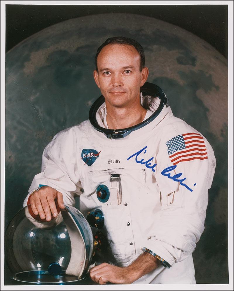 Color satin-finish 8 x 10 photo of Collins posing in his flight suit against a lunar background, signed in blue felt tip. A small fingerprint to lower right, otherwise very fine condition.