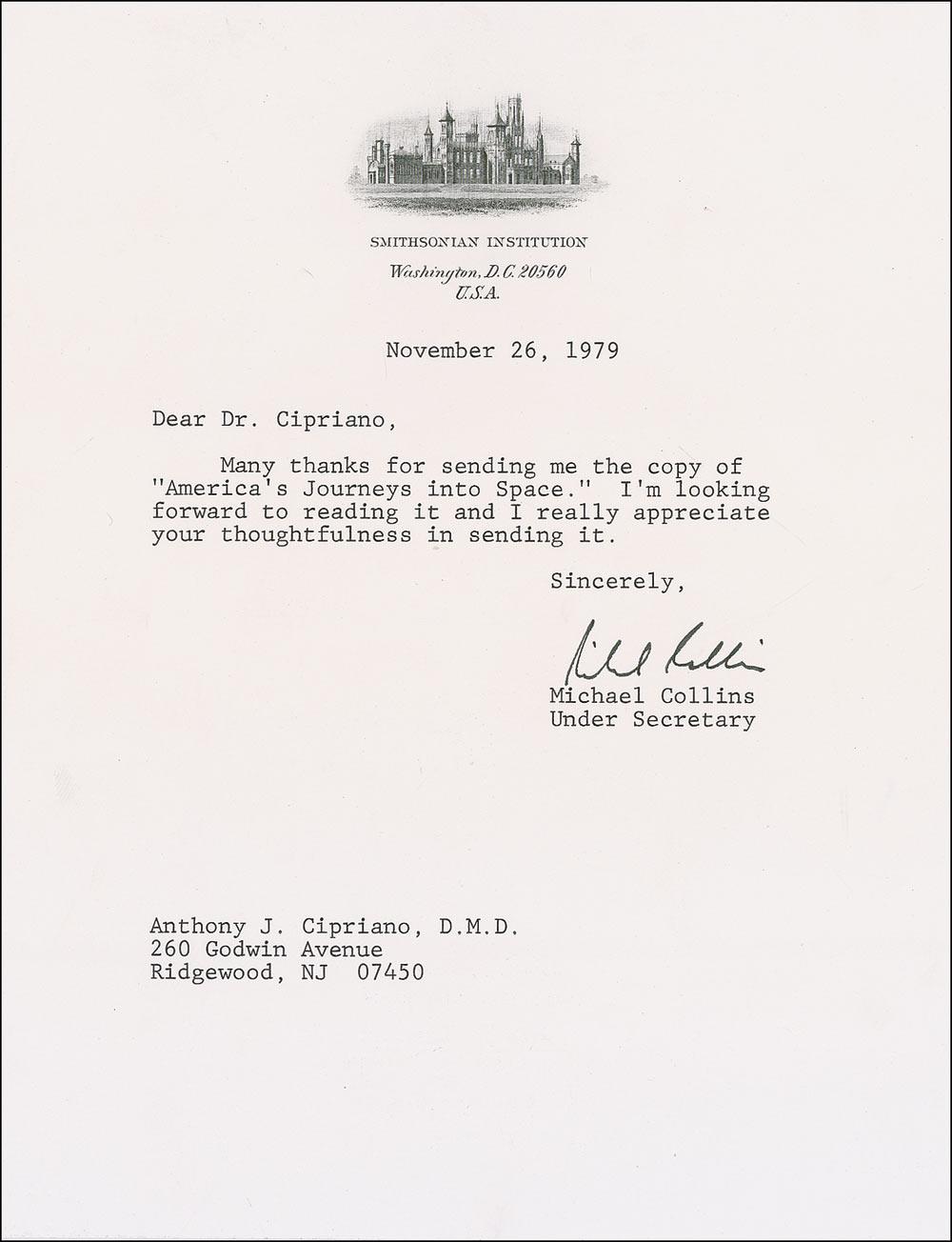 TLS, one page, 7 x 9, Smithsonian Institute letterhead, November 26, 1979. Letter to Dr. Anthony Cipriano. In full: "Many thanks for sending me the copy of "America's Journeys into Space." I'm looking forward to reading it and I really appreciate your thoughtfulness in sending it.” In fine condition. Accompanied by the original mailing envelope.